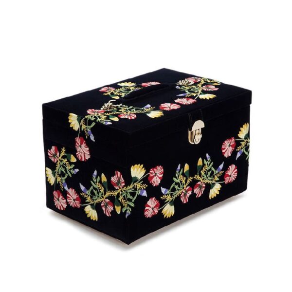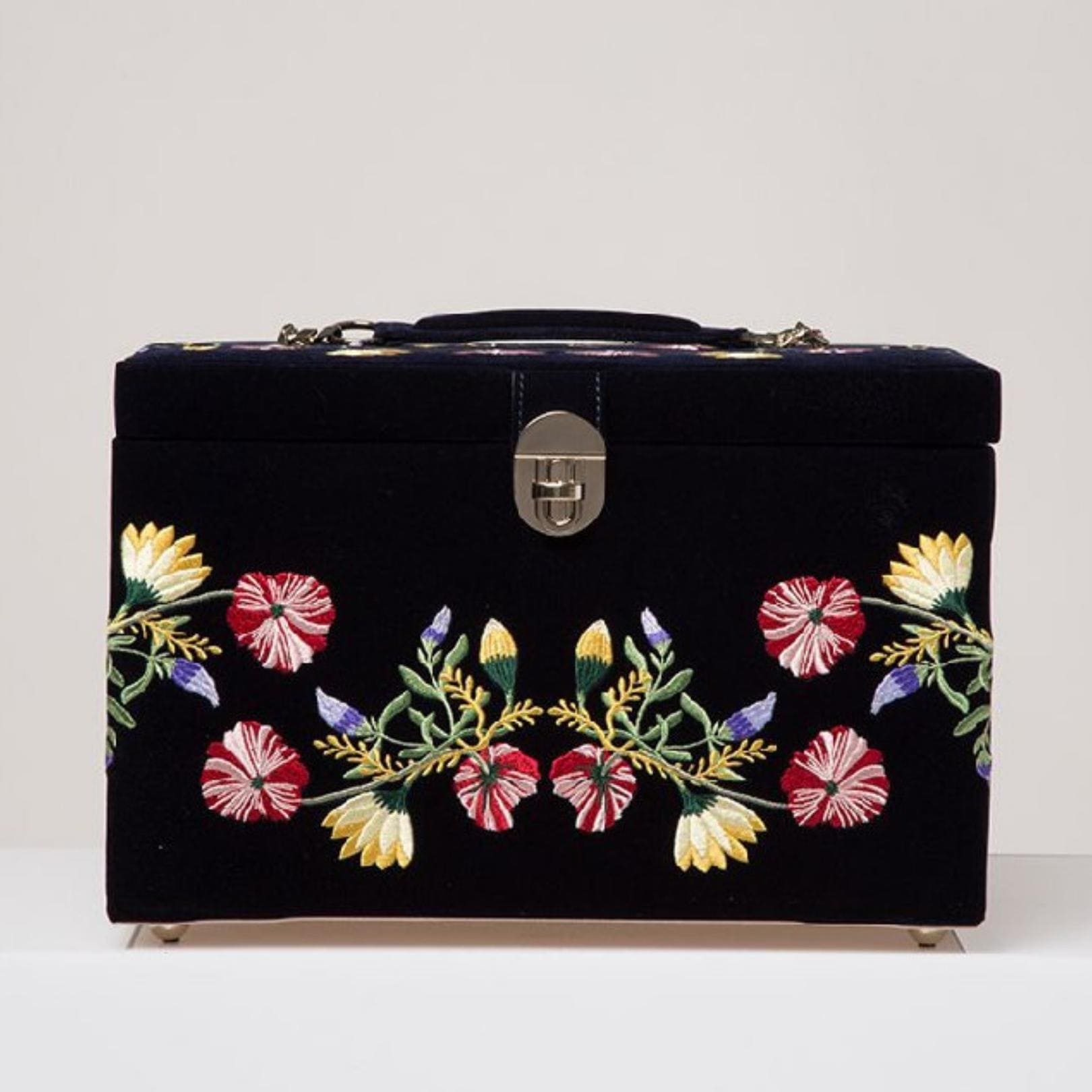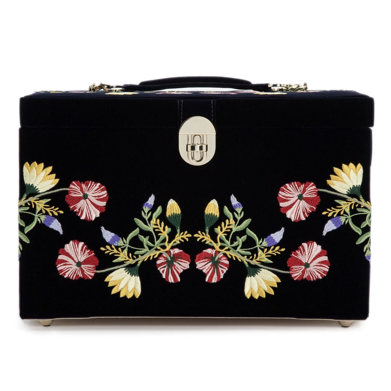 Fresh faced and fun, Zoe is sophisticated but playful. The Large case’s soft mink body highly embroidered with classic floral designs is as beautiful as its accessories inside. Includes mink velvet exterior, LusterLoc™ interior, pale gold hardware, and removable mini travel piece.