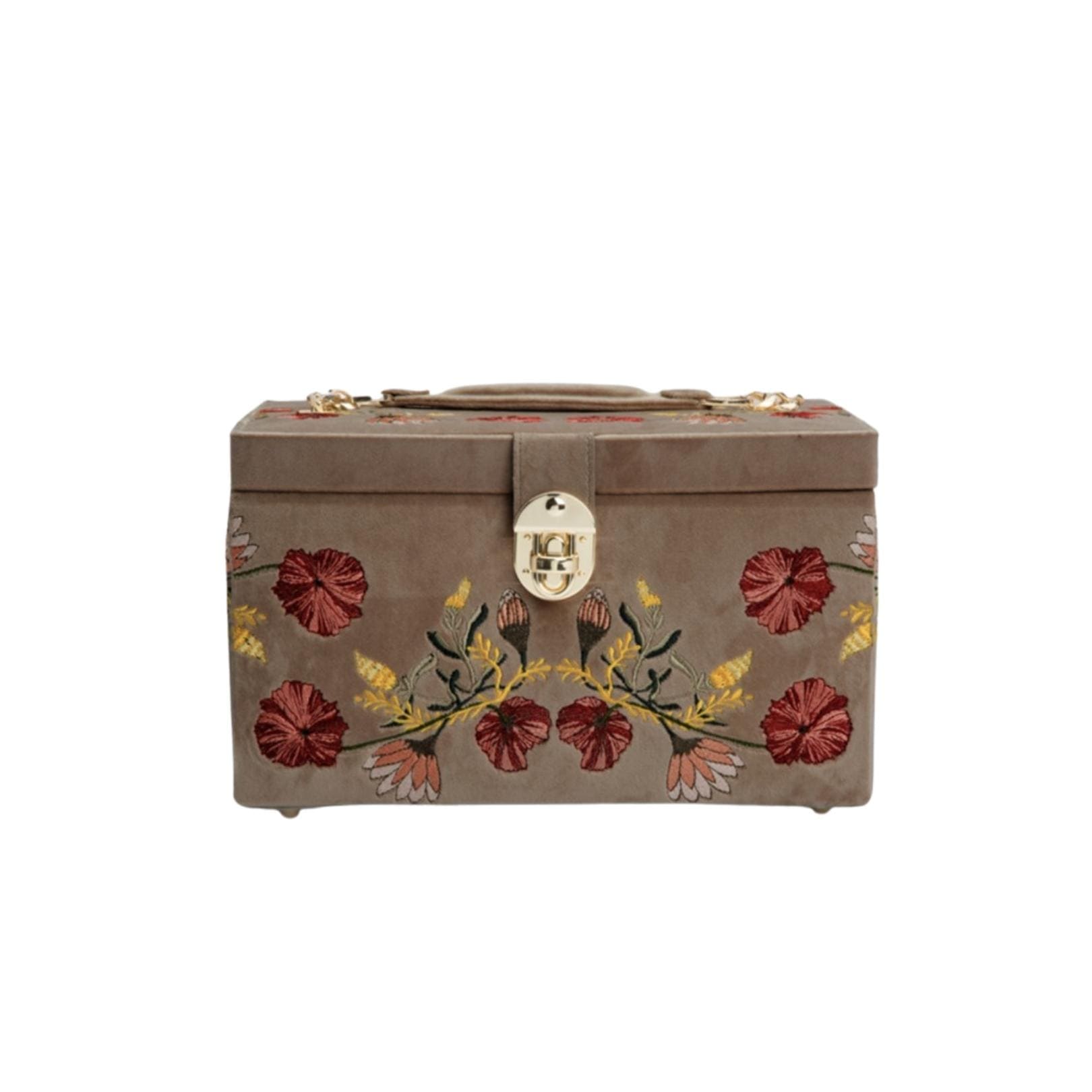 Fresh faced and fun, Zoe is sophisticated but playful. The Medium case’s soft forest green body highly embroidered with classic floral designs is as beautiful as its accessories inside. Includes velvet exterior, LusterLoc™ interior, pale gold hardware, and removable mini travel piece.