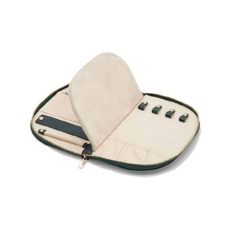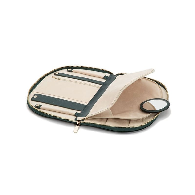 Storage: Earring holder 2, ring roll 2, zip pocket medium 1, zip pocket large 1, necklace holder 4, removable round mirror 1