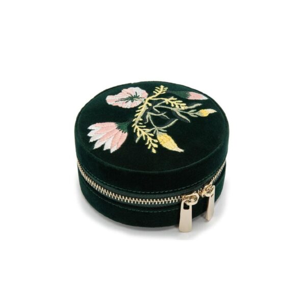 Fresh faced and fun, Zoe is sophisticated but playful. Add romance to your travel accessories with the elegant floral embroidery and jewel-tone velvet travel round. Includes velvet exterior, LusterLoc™ interior, zip pouch, and mirror.