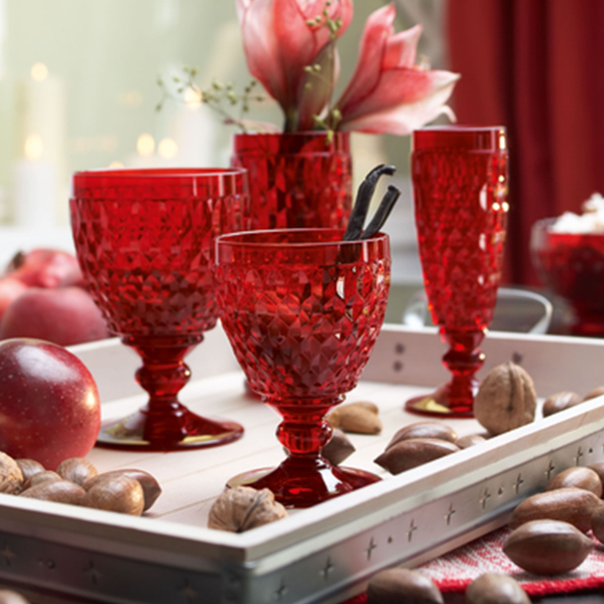 A striking facet design and the robust, high-quality crystal glass make the coloured glasses from the Boston Coloured collection an attractive eye-catcher every day and on festive occasions too. Theres a subtle tingling in the air. Serve champagne, a fruity sparkling wine or prosecco in this elegant red champagne glass. Enjoy the laidback countryside lifestyle.
