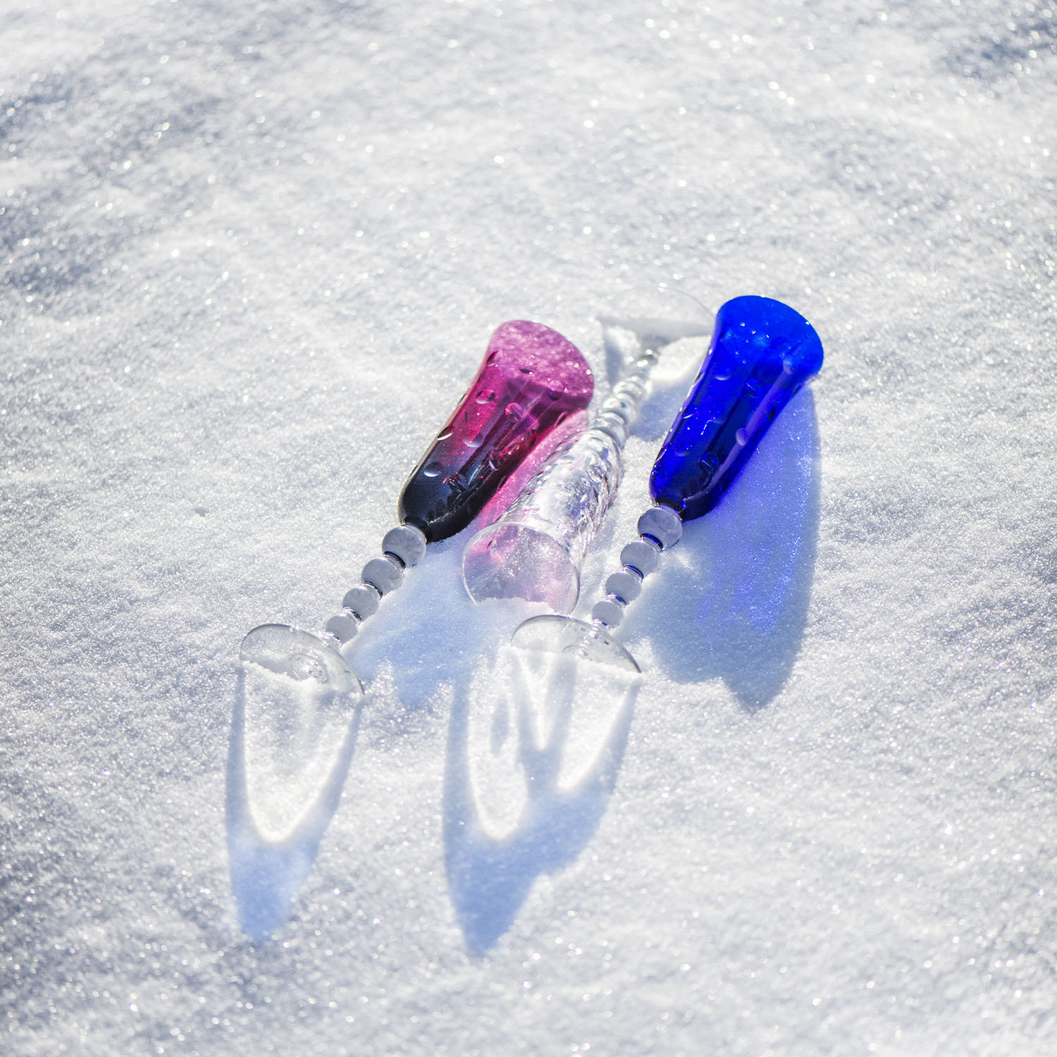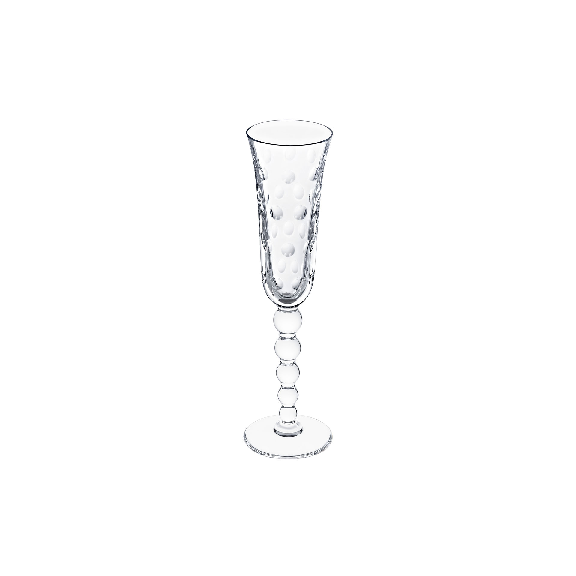 Bubbles Champagne flute. Vibrant and sensual, designed as part of a vast service of shapes and uses, from tableware to bar patterns, Bubbles reinvigorated the art of creation of clear and coloured crystal within Saint-Louis. A mischievous stack of crystal marbles on the stem and bubbles, dotting the parison, are the hallmarks of this original service.