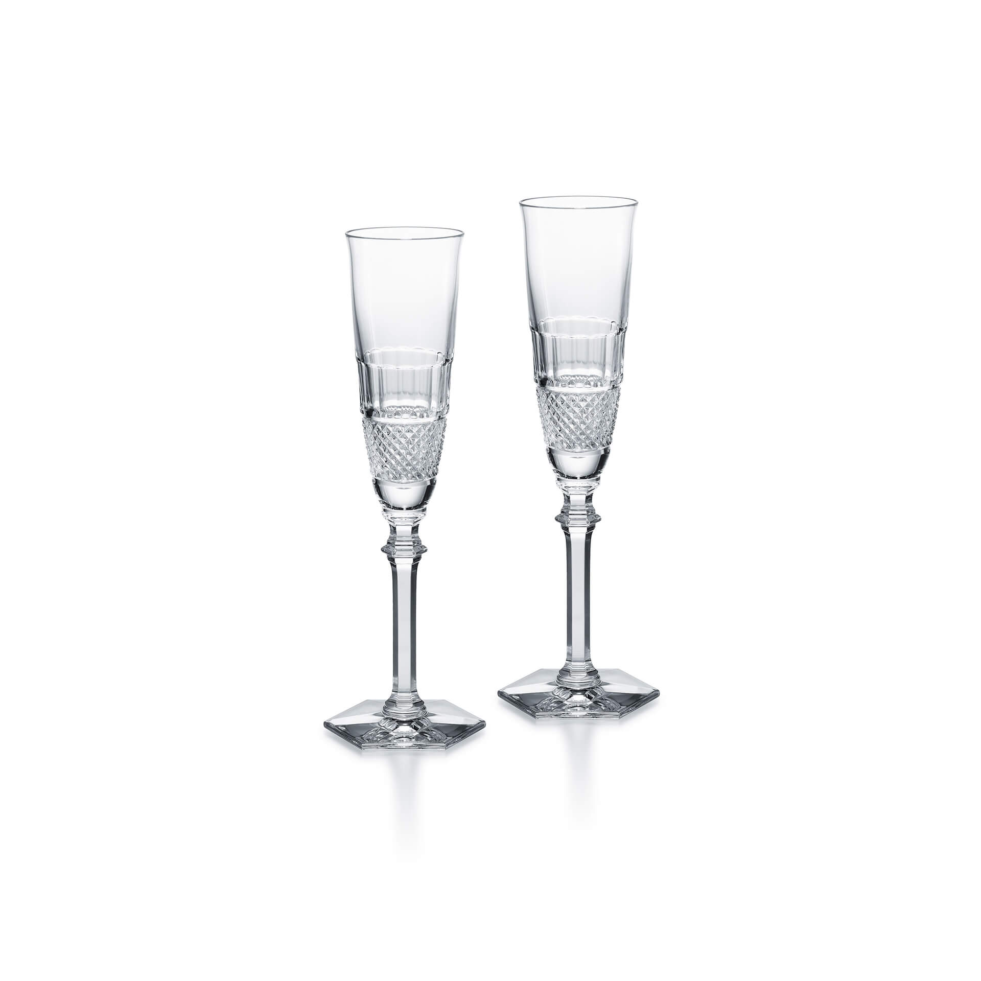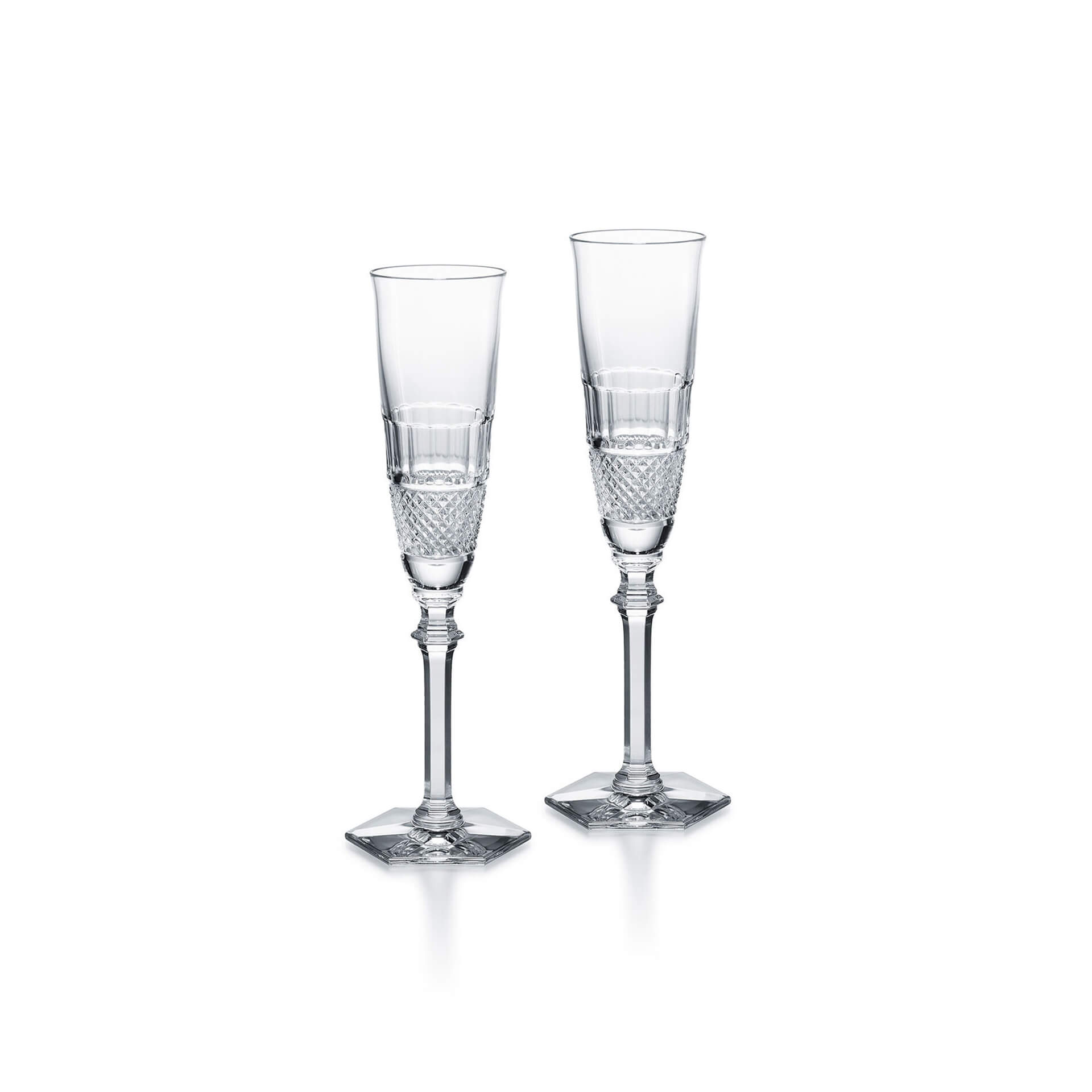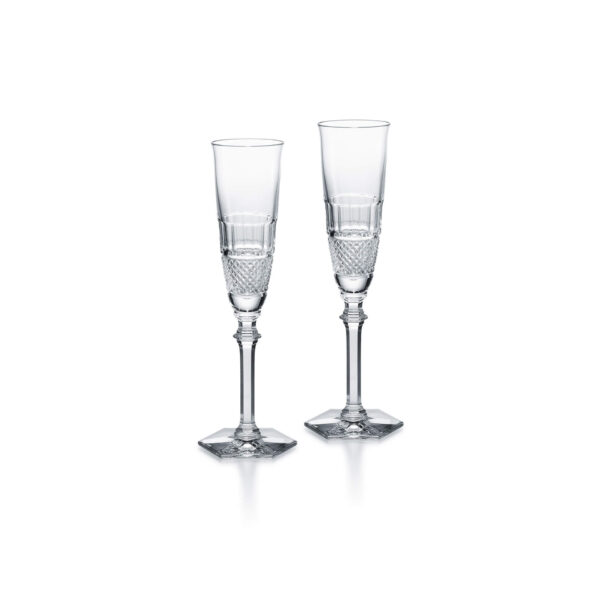 Thomas Bastides stylish clear crystal Diamant collection draws inspiration from Baccarat heritage in reviving the charm of the pointed diamond cut to complement the slender, graceful forms of this glass. The glass is shaped in a glittering display of Baccarat craftsmanship. The striking design stands out as a timeless Baccarat classic. The collection comprises glasses in four sizes and a champagne flute as well as a set of three matching tumblers.