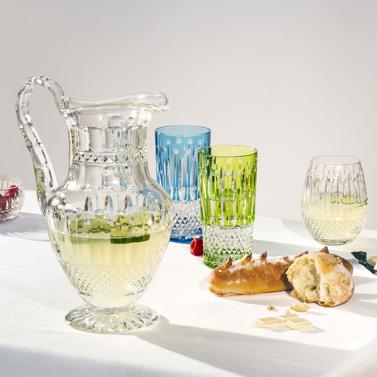 Tommy Sky blue Shot. From its star-shaped base to the sparkling glints of the diamond, bevel, pearl and rim cuts, Tommy stands as a timeless collection since 1928. Its straight lines have afforded elegance to the most refined interiors, all the way to the Hall of Mirrors at in Versailles. What if the exceptional became an everyday celebration? Tommy spreads out its audacious colors to offer functional new creations for contemporary uses, and reveals a brand-new facet: lighting.
