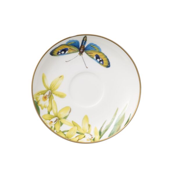 Stylish espresso indulgence. Unusual shapes and richly detailed exotic decorations in bright colours make the Amazonia Anmut collection from Villeroy Boch truly eye-catching. This refreshingly decorated espresso cup saucer adds a particularly attractive, colourful element to your service. Serve sinfully sweet pastries with bitter coffee specialities on this attractive espresso saucer.