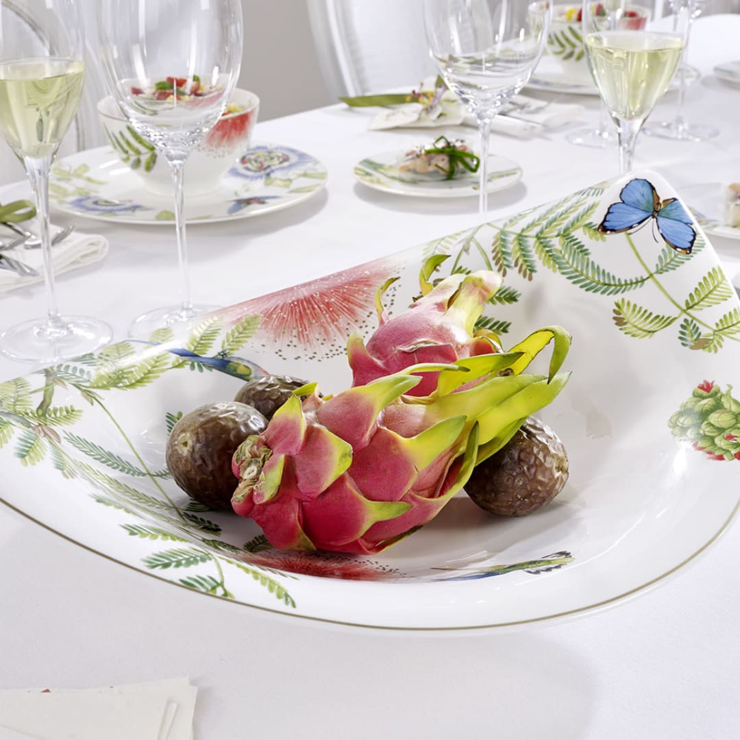 A touch of the exotic for your home. Amazonia is inspired by the flora and fauna of the Amazon. Delicate motifs, intense colours and gold details create an almost three-dimensional look feel: mysterious, breathtaking and extravagant. The gently curved bowl shaped like a leaf made from high-quality Premium Bone Porcelain is ideal for all kinds of occasions. It is a beautiful way to arrange fruit or decoration for your home. Bring a touch of the exotic to your home.