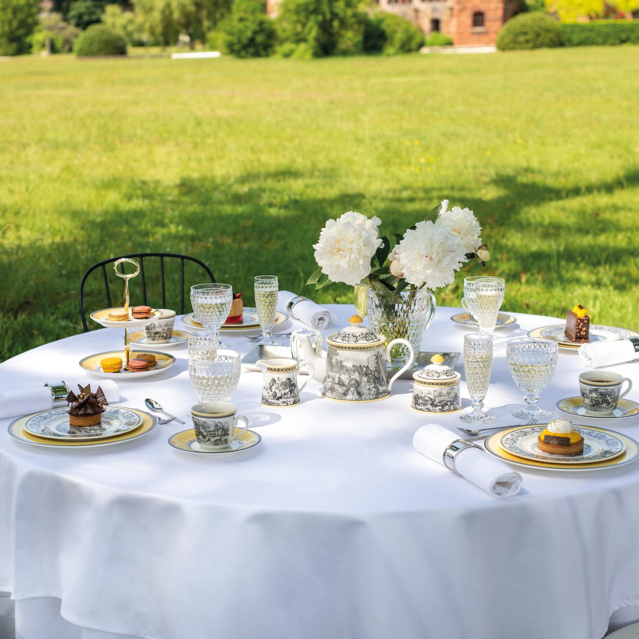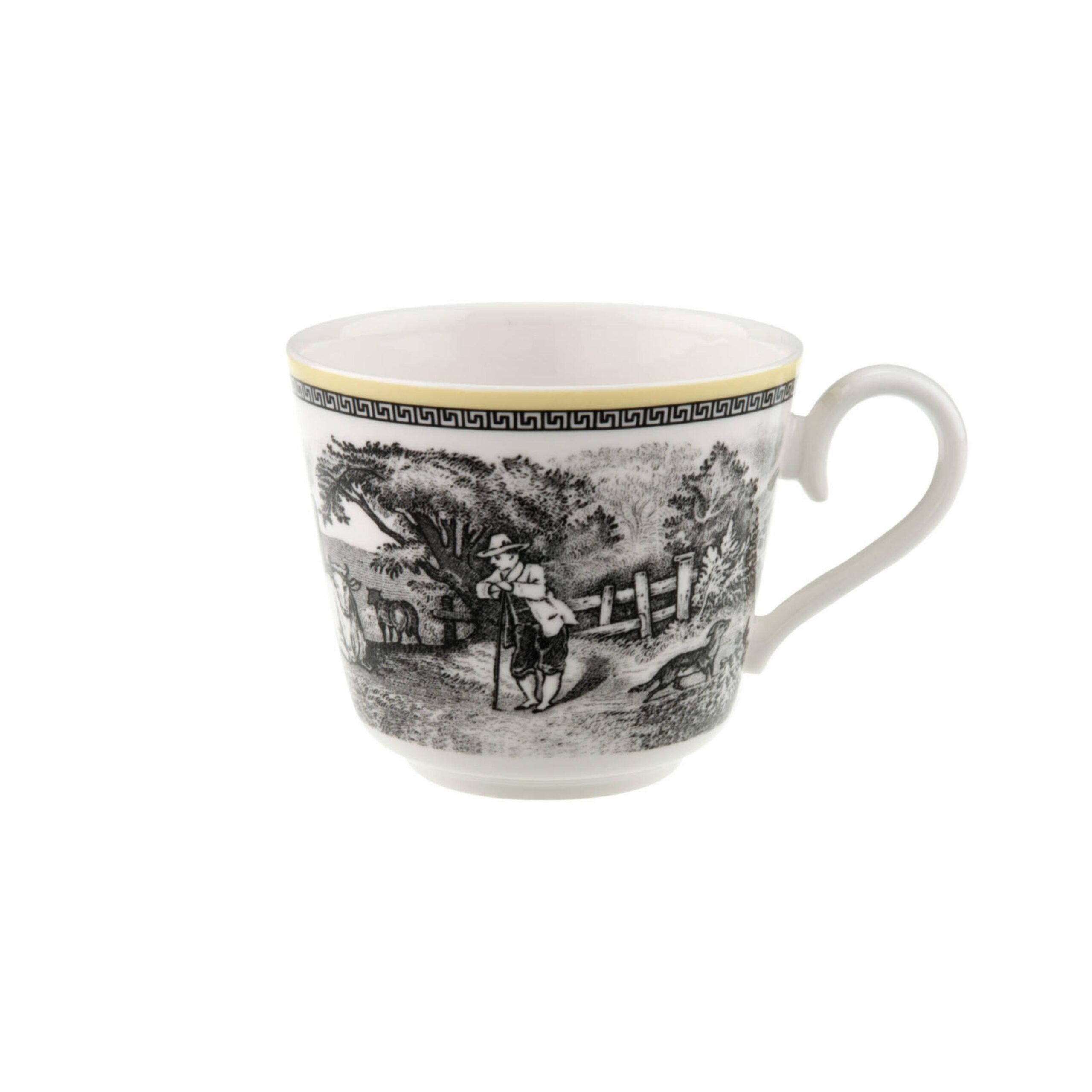 This breakfast cup forms part of Villeroy Bochs country style pattern Audun Ferme. With this pattern Villeroy Boch exquisitely bridges past, present and future inspired by copper engraved designs from the turn of the last century. Pastoral scenes in black and white have been freshened up by a creamy yellow accent border and other graphic ornamentations. 4 patterns together yield a strong fashion statement to dress up your table or hang decorative plates on the wall. The 4 ranges are: Femme, Promenade, Fleur and Chase. Audun is a small village in what is now the Lorraine Provence of France and was the first pottery set up by the Boch members of the family.