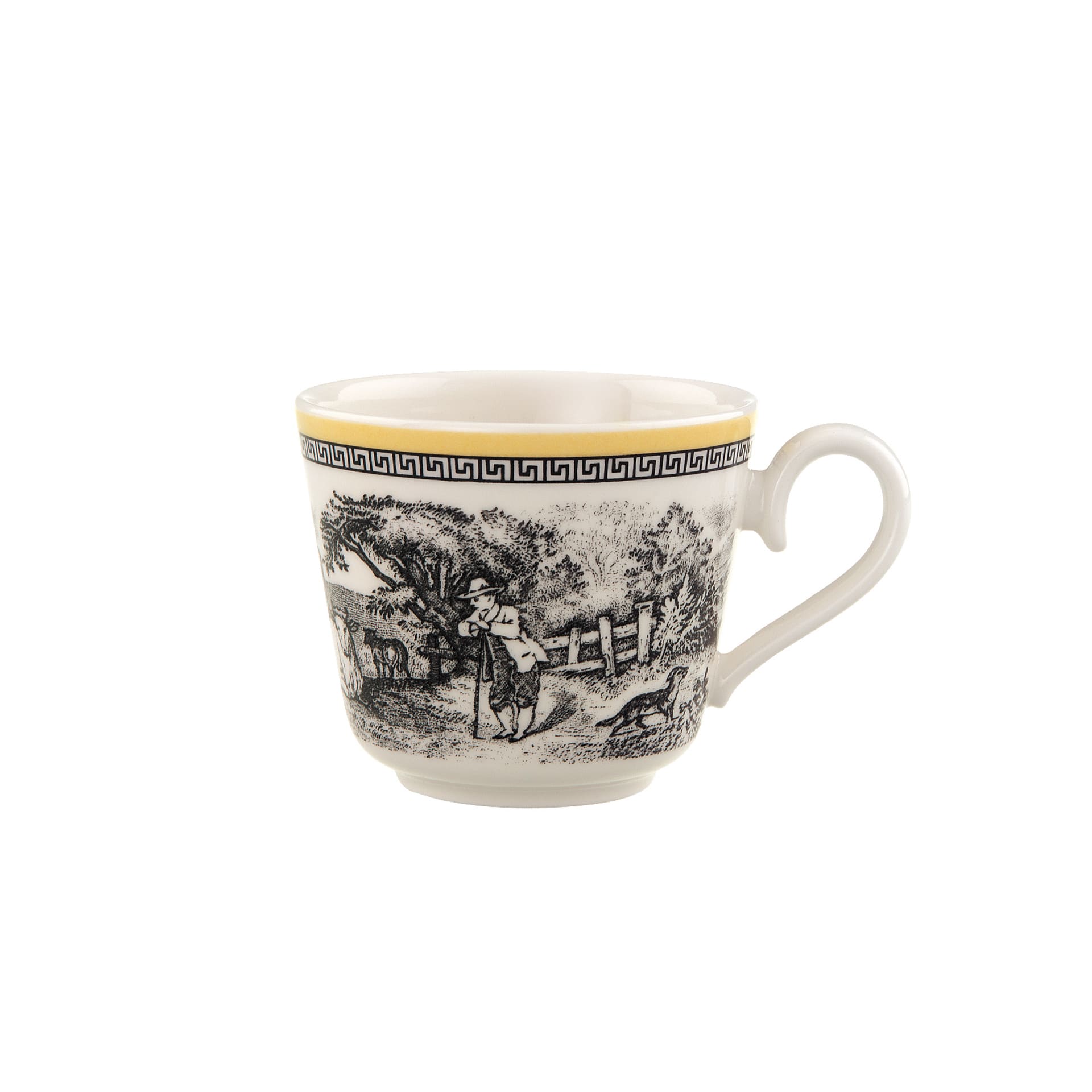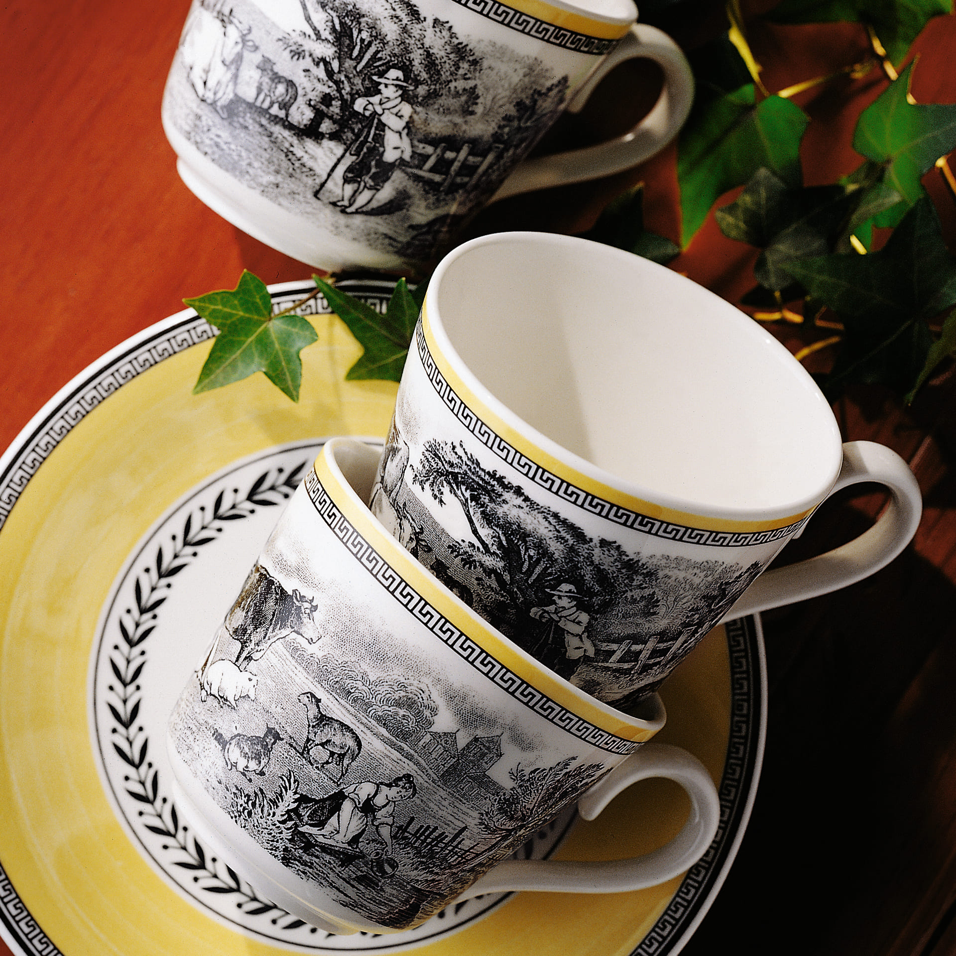 This espresso cup forms part of Villeroy Bochs country style pattern Audun Ferme. With this pattern Villeroy Boch exquisitely bridges past, present and future inspired by copper engraved designs from the turn of the last century. Pastoral scenes in black and white have been freshened up by a creamy yellow accent border and other graphic ornamentations. 4 patterns together yield a strong fashion statement to dress up your table or hang decorative plates on the wall. The 4 ranges are: Femme, Promenade, Fleur and Chase. Audun is a small village in what is now the Lorraine Provence of France and was the first pottery set up by the Boch members of the family.