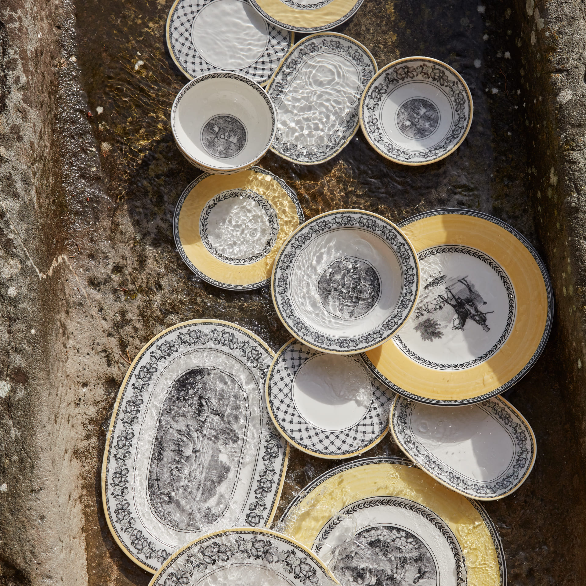 This oval platter forms part of Villeroy Bochs country style pattern Audun Ferme. With this pattern Villeroy Boch exquisitely bridges past, present and future inspired by copper engraved designs from the turn of the last century. Pastoral scenes in black and white have been freshened up by a creamy yellow accent border and other graphic ornamentations. 4 patterns together yield a strong fashion statement to dress up your table or hang decorative plates on the wall. The 4 ranges are: Femme, Promenade, Fleur and Chase. Audun is a small village in what is now the Lorraine Provence of France and was the first pottery set up by the Boch members of the family.