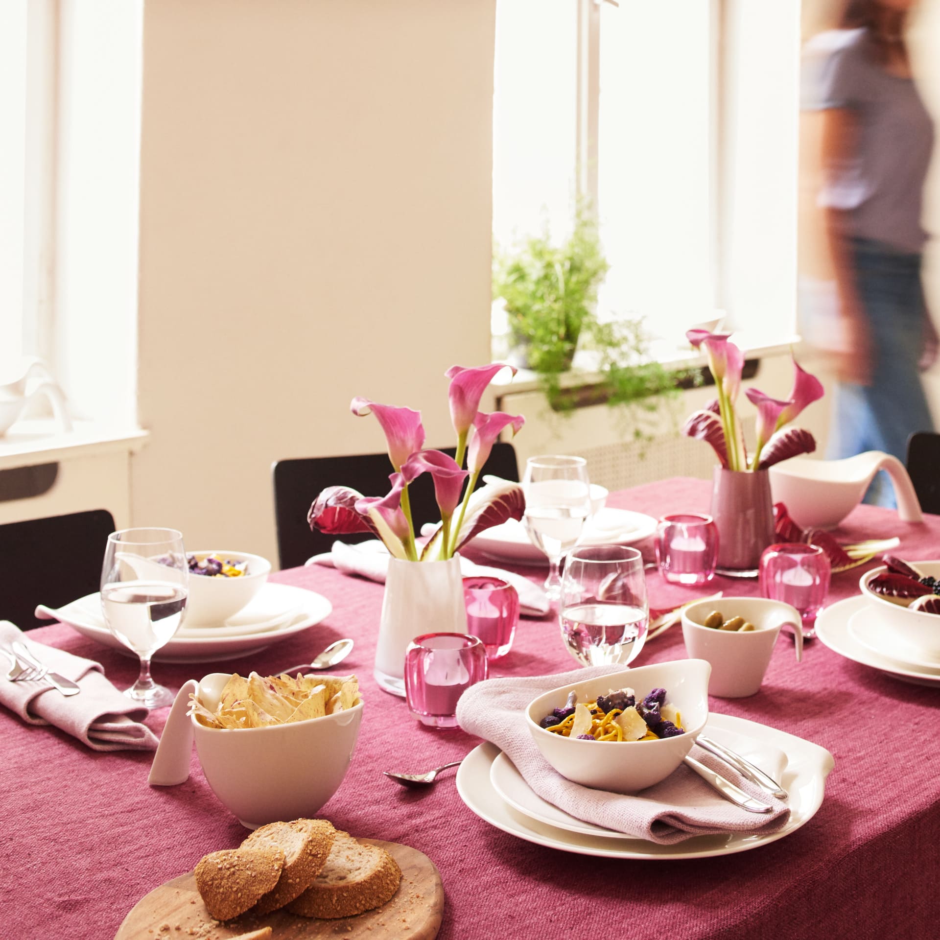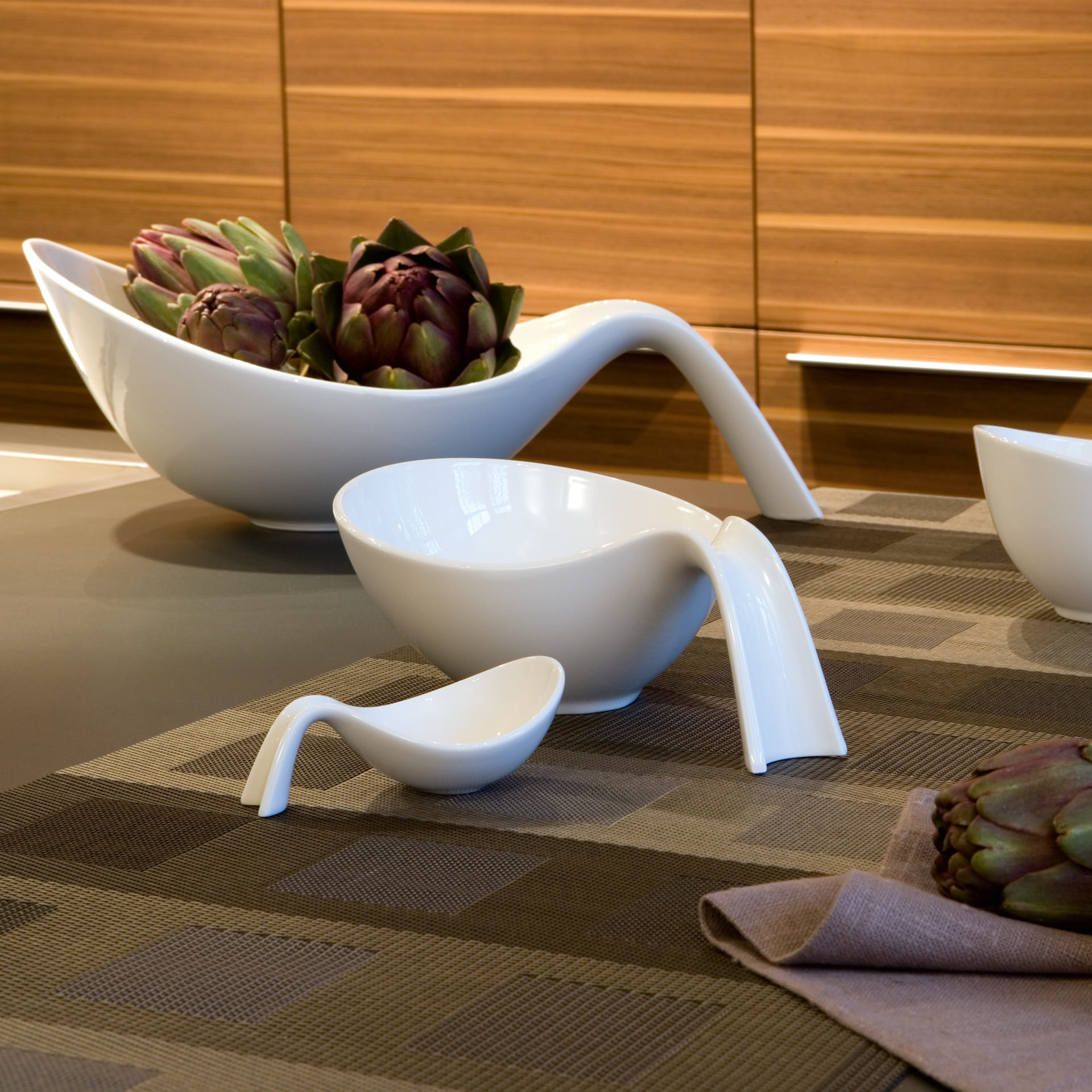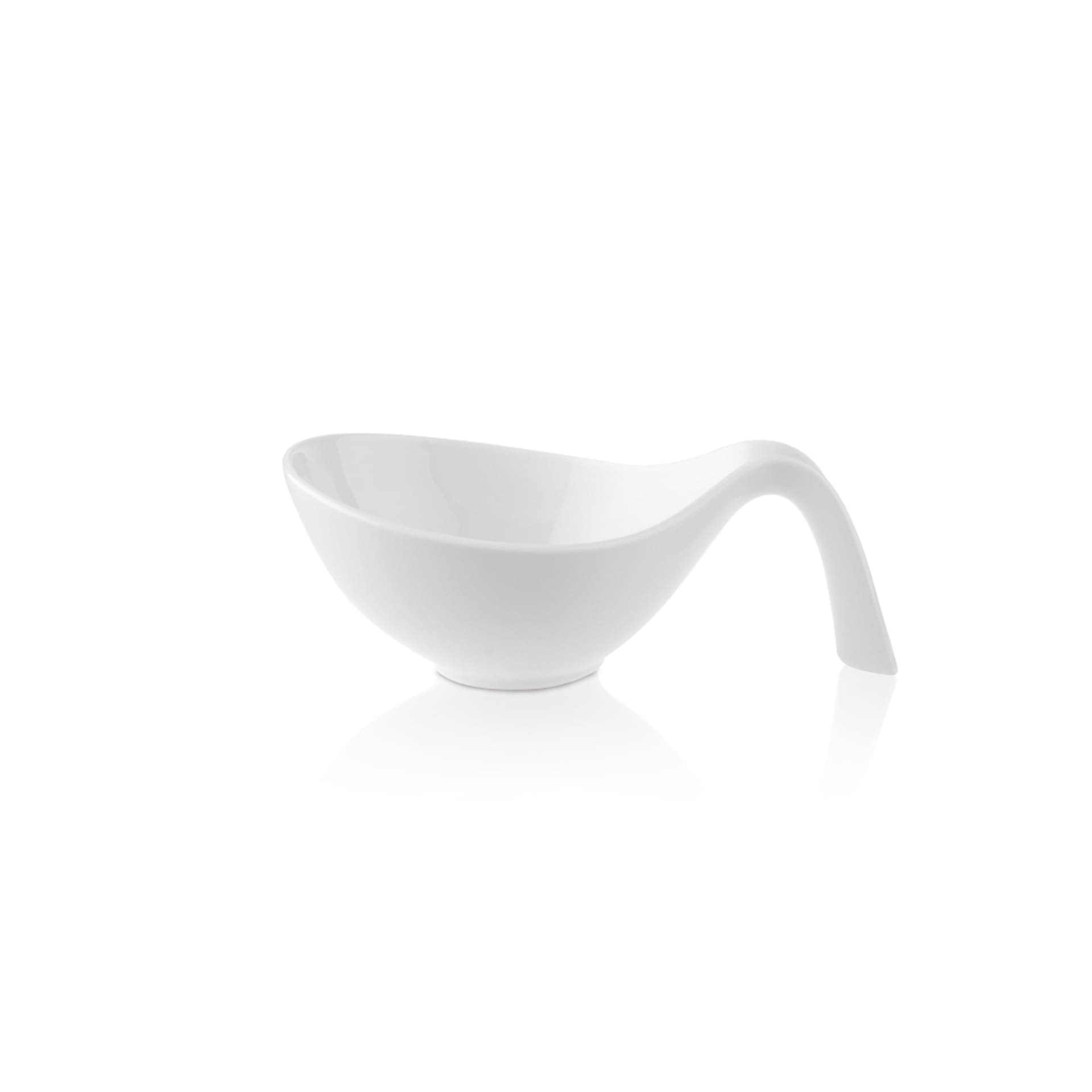 Versatile bowl with a modern design and a handle. The elegant, pure white Flow crockery range made of high-quality Premium Porcelain captivates with bold curved lines and a timeless elegance. Modern porcelain design, perfect for every occasion whether casual or a certain chic. This versatile bowl makes fresh salads, whether as a side dish or a light lunch, taste even better. Discover the versatile crockery for your home.