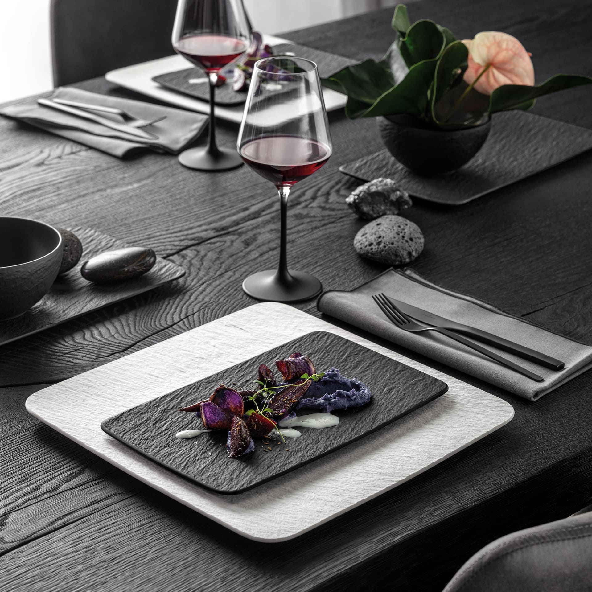 Slate look with an extraordinary shape. Manufacture Rock is something very special: an innovative use of materials, matt-structured porcelain surfaces and the expressive black give the iconic on-trend range its unique slate look and exceptional feel. Can be combined with the entire Manufacture range for an exciting look. Why do plates always have to be round? Manufacture Rock breaks the mould in many ways – this unusual plate is just one example of how you can enhance any meal with extraordinary design. Treat yourself to distinctive design.