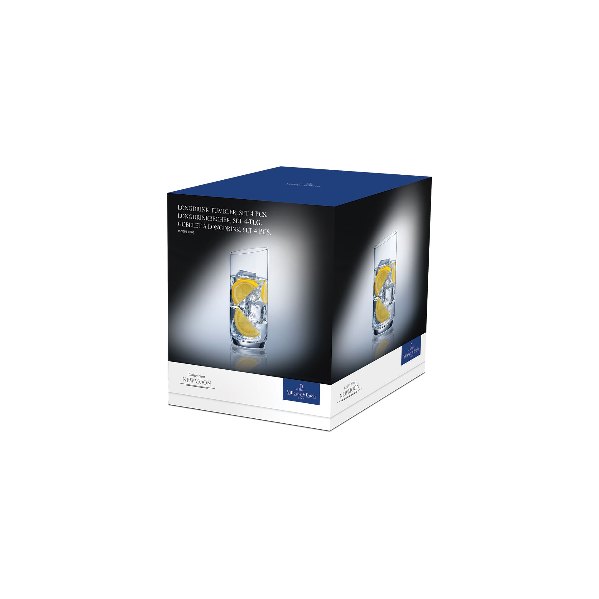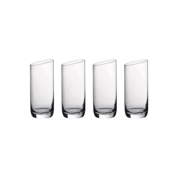Long drink glass with a unique design. Expressive, functional, puristic – enjoy unique design with NewMoon, be it for everyday use or special occasions. The striking rim in the shape of a narrow crescent moon and the resulting slight asymmetry reflect the clear character of the collection. This set of 4 long drink glasses features an innovative, tactile design. Can be used from all sides. Experience moon-inspired design.