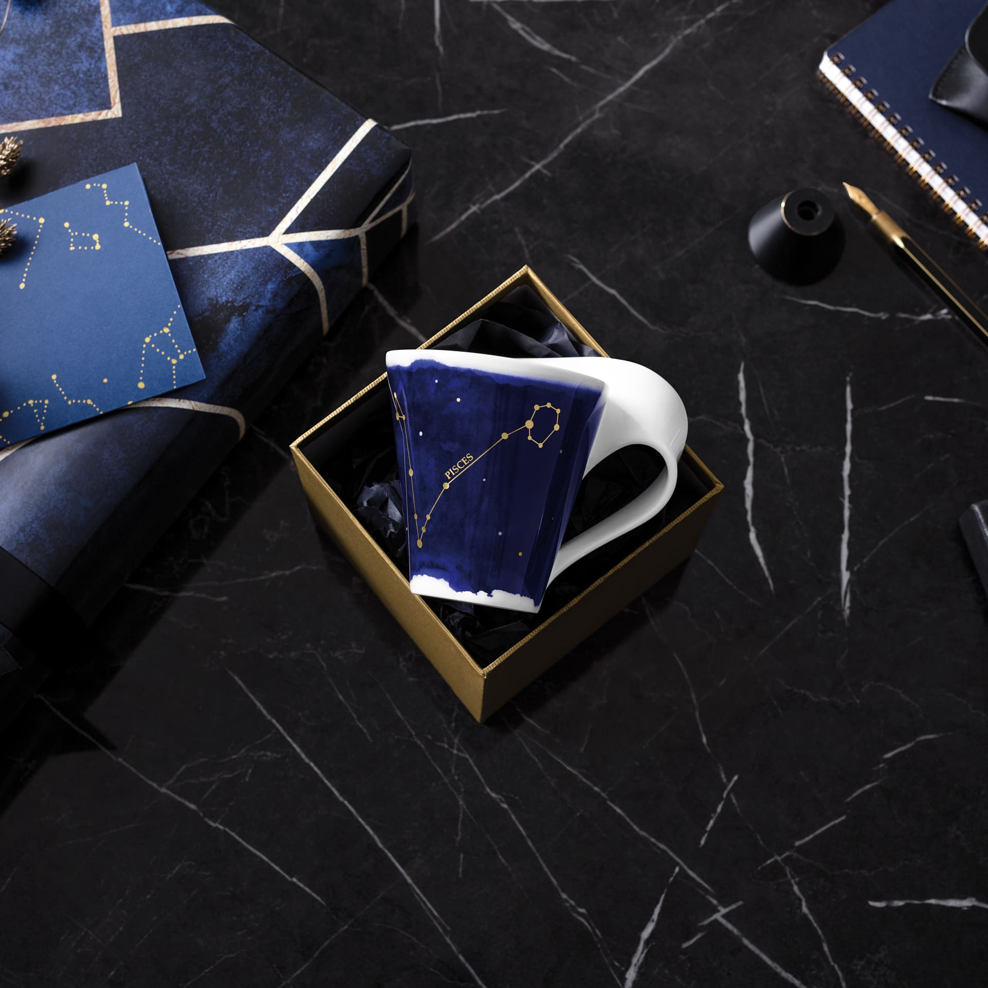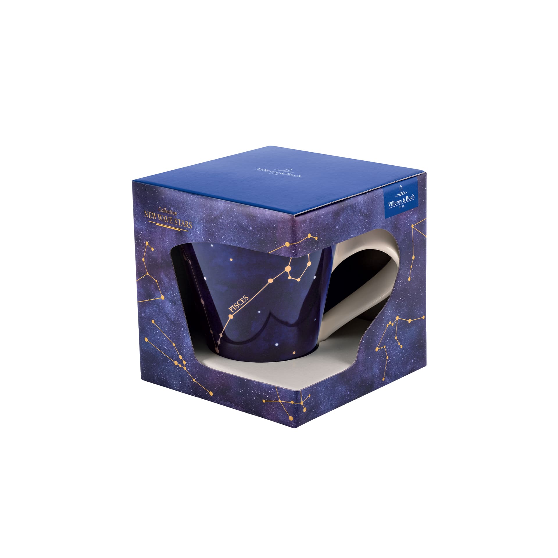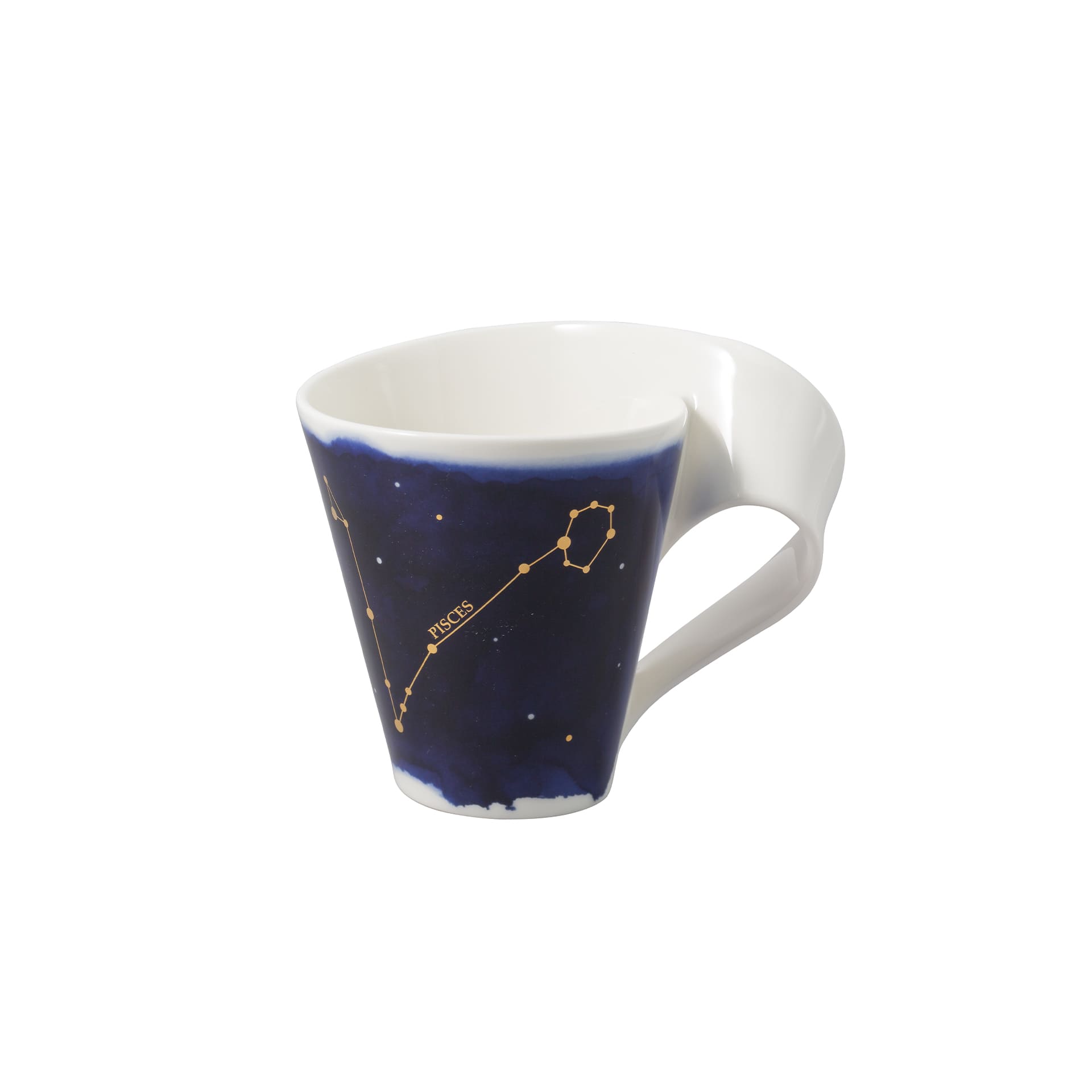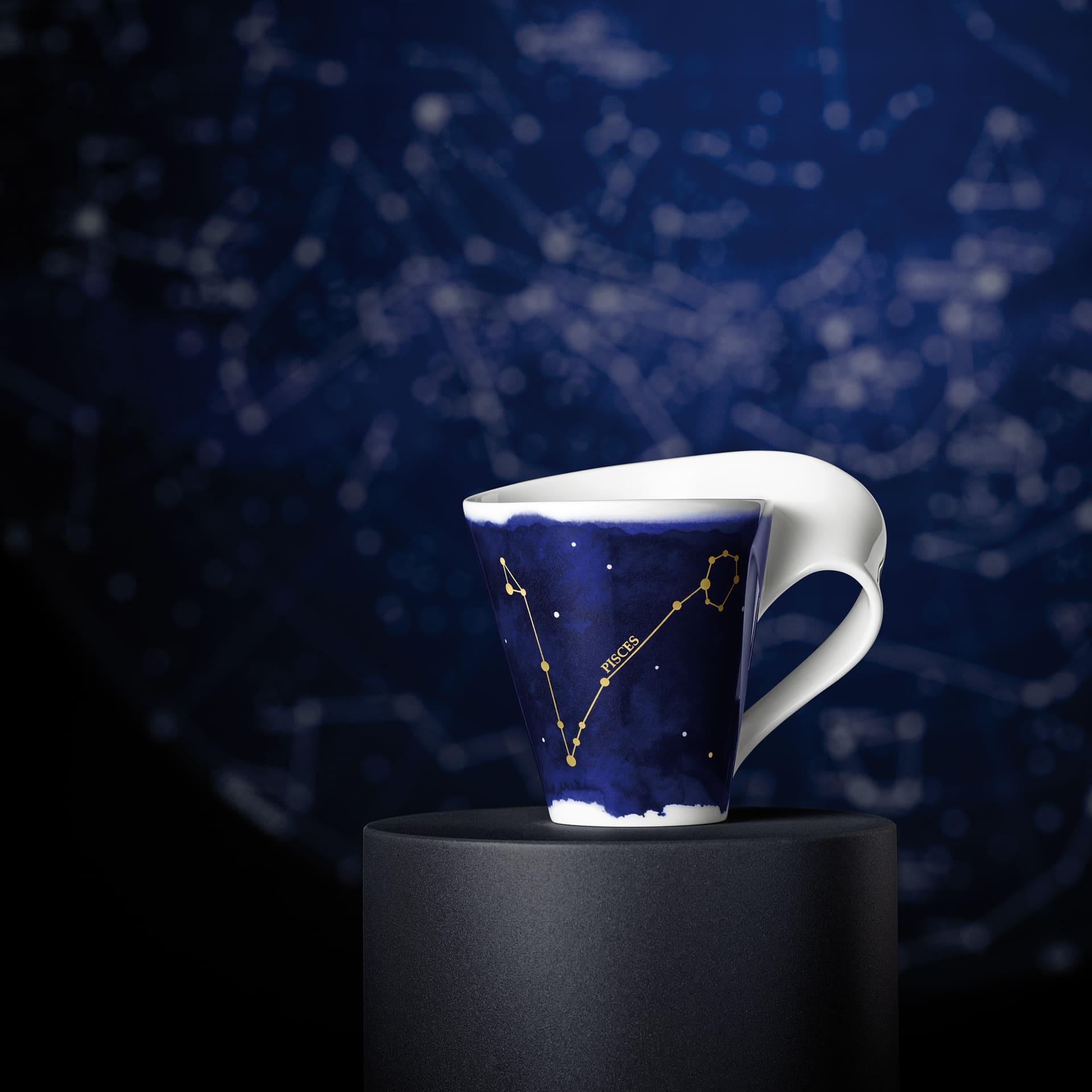 Stylish mug with a zodiac sign. Our NewWave Stars collection is under a lucky star. Give the finest porcelain bearing the zodiac sign of your loved ones, friends or colleagues or simply treat yourself to some heavenly delight. This stylish mug shows the zodiac constellation of Pisces. The high-quality real gold motif looks delicate on the artistic blue night sky. Reach for the stars!