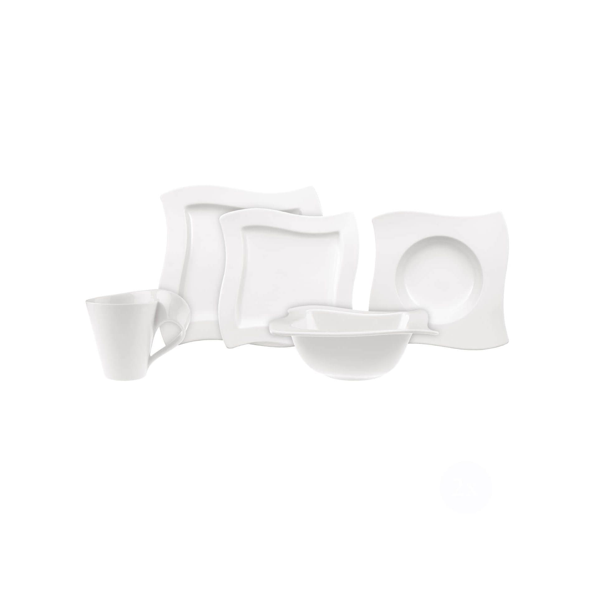 The NewWave collection boasts an asymmetrical shape and curving lines. Awarded the “Trend Dish of the Year”, the decor has been a bestseller from the very start and is a stunning centrepiece on any table. This starter set consists of 2 coffee mugs, flat plates, soup plates, salad plates and practical bowls. You always have the right tableware to hand from morning to evening. Also an ideal gift for moving in. Equip your home with beautiful crockery.