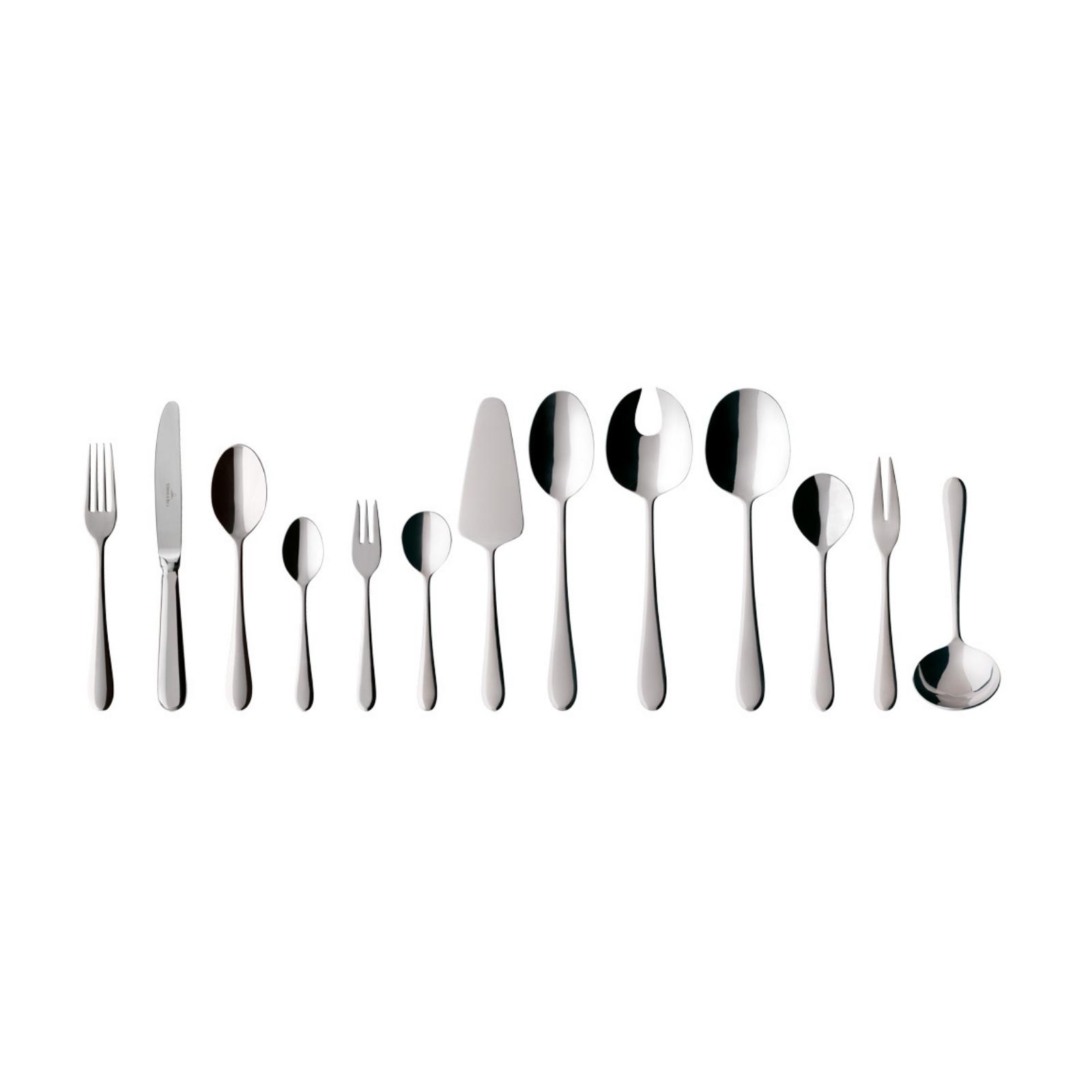 – 12 Spoons, 12 forks, 12 knives, 12 coffee spoons, 12 cake forks, 1 soup spoon, 1 meat fork, 1 vegetable spoon, 1 salad spoon, 1 salad fork, 1 sauce ladle, 1 cake server, 1 sugar spoon