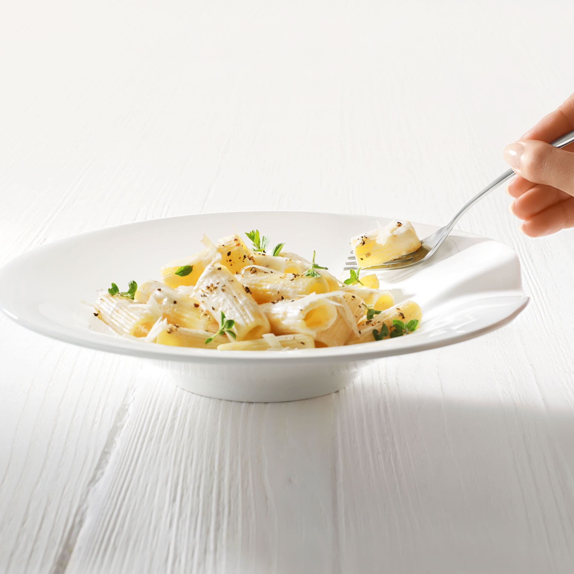 The practical plates and accessories in the Pasta Passion range turn delicious pasta, from spaghetti to lasagne, into pure pleasure. Awarded the “Golden Award – Best of the Best” and the Red Dot Design Award 2016. These two pasta plates with a cutlery rest are perfect for enjoying penne, fusilli and more at the table or on the sofa. It features a sophisticated design: when you push your fork along the rim of the plate, the pasta slides easily onto your fork. Be inspired by Pasta Passion for real pasta lovers.