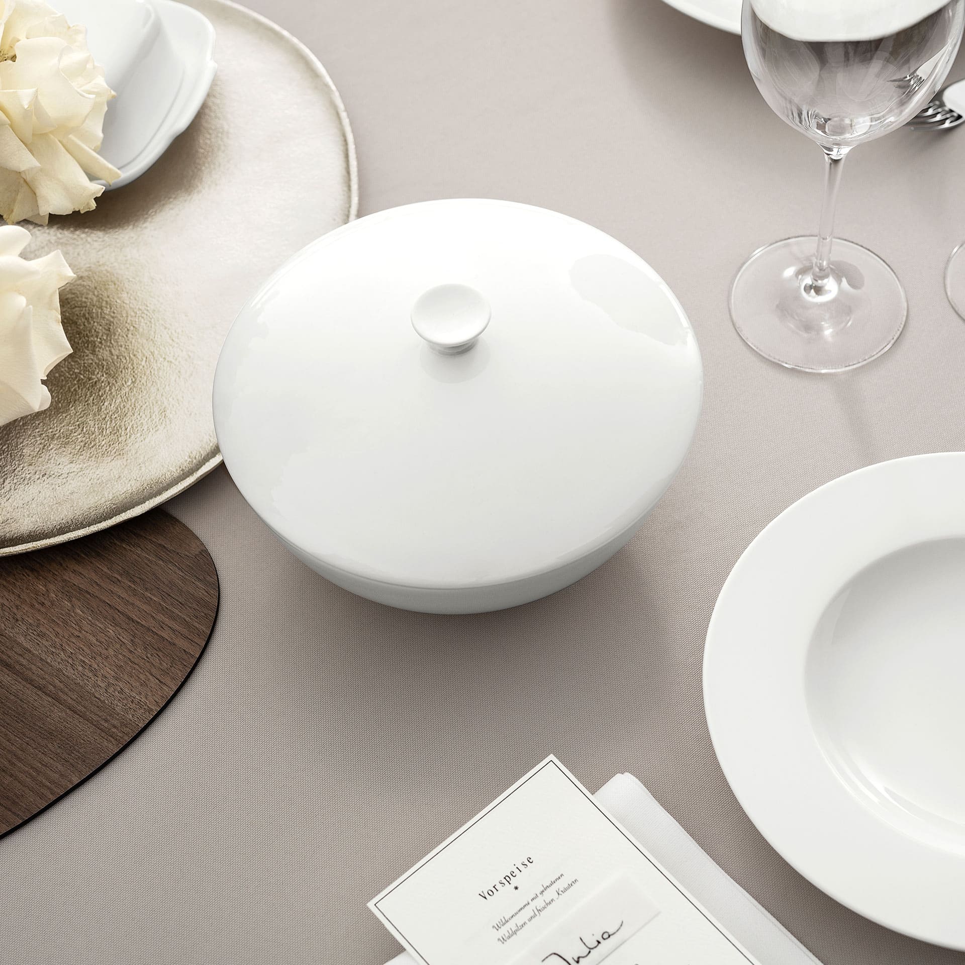 The classic Royal crockery collection with its modest form and timeless design is the perfect accompaniment for any occasion. The wide range of fine Premium Bone Porcelain captivates with its brilliant glow and particularly durable workmanship. Treat yourself and your guests to delicious side dishes in this attractive bowl with a lid. Serve delicious food in an elegant way.