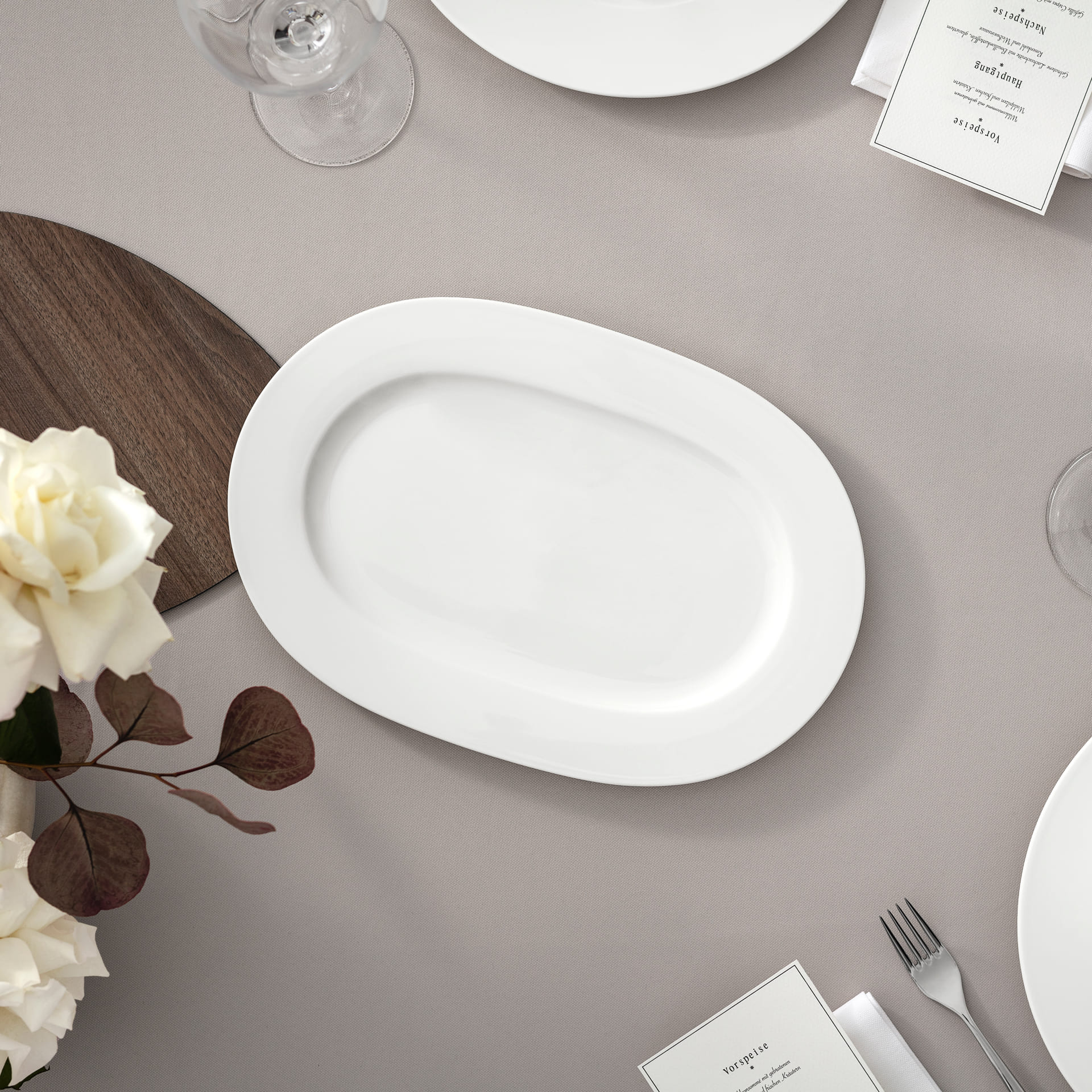 Oval plate for delicious main dishes. The classic Royal crockery collection with its modest form and timeless design is the perfect accompaniment for any occasion. The wide range of fine Premium Bone Porcelain captivates with its brilliant glow and particularly durable workmanship. Present cold cuts or your cake specialities in style with the oval plate. Serve delicious food in style.
