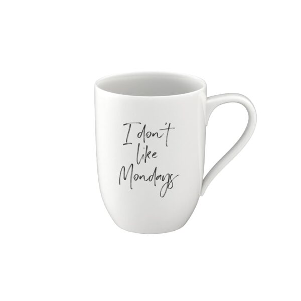 Coffee breaks with a personal message. Your mug, your message! Our popular mug now makes clear statements, whether it be for you or as a gift for a special person. The mug is printed on one side with the words I dont like Mondays. Thanks to the simple, white porcelain, it matches many collections and offers you numerous combination options. Which mottos are your favourites?
