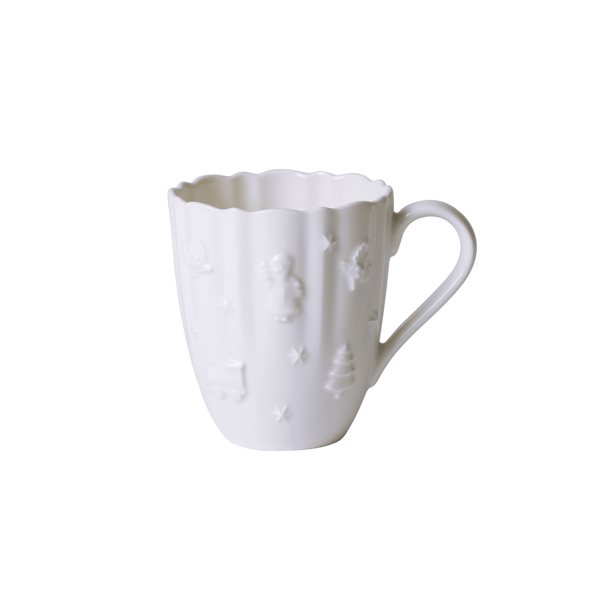 Mug for tea, coffee, cocoa, punch or mulled wine. Toy‘s Delight Royal Classic is inspired by the shape of nostalgic paper plates, decorated with a high-quality porcelain relief. This relief is adorned by motifs of typical toys from the Ore Mountains. The pure white collection goes beautifully with the Toy‘s Delight items in Christmas colours. Enjoy coffee, tea or mulled wine from this large, practical mug. Enjoy the magic of Christmas.