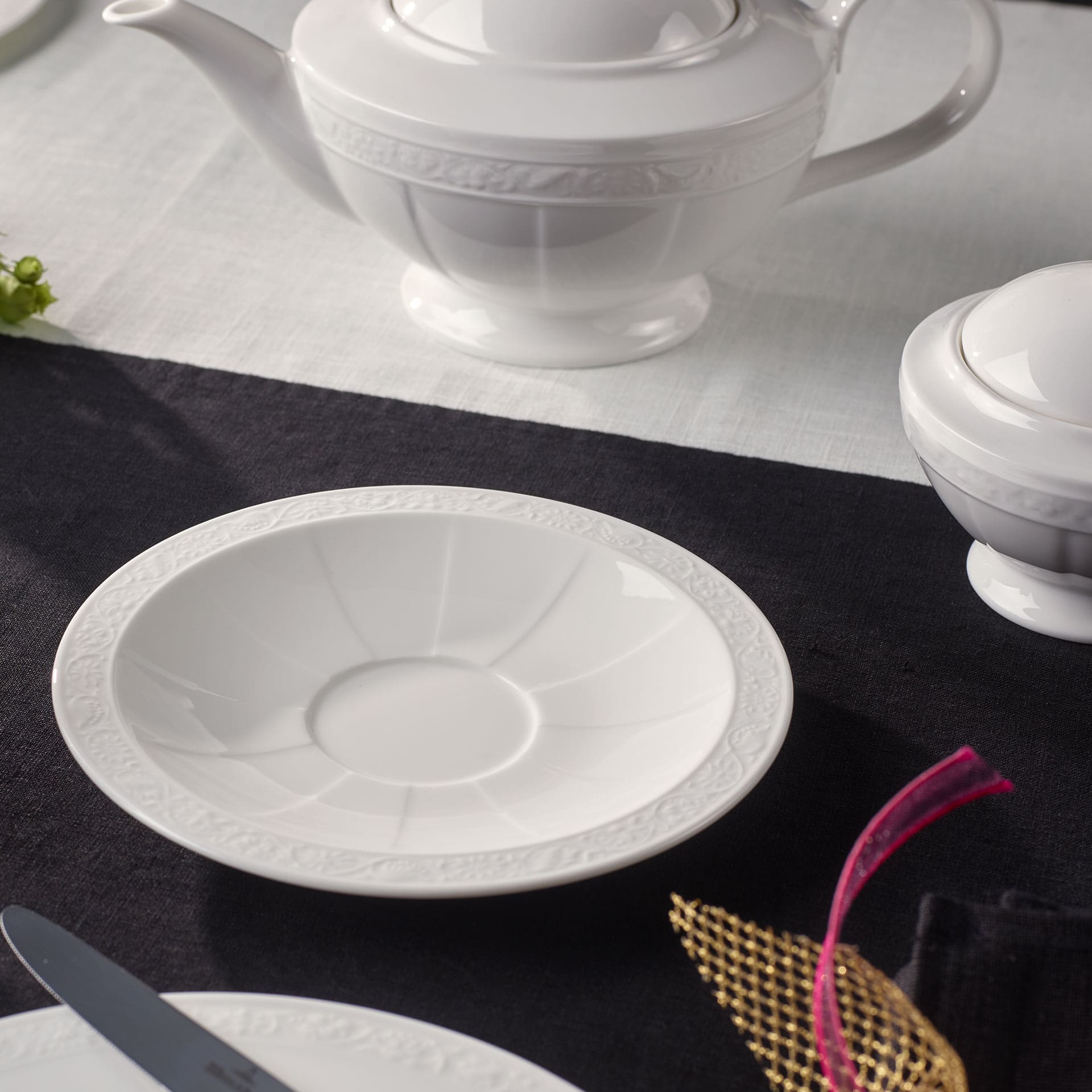 Villeroy Boch offers delicate porcelain crockery in a classic design with its White Pearl. The gleaming white and the subtle decorations underscore the elegant character of the collection. This handy saucer offers space for a sweet little treat or a fresh croissant with that morning coffee. Add outstanding elegance to your coffee table with this fine coffee cup saucer from the White Pearl collection.