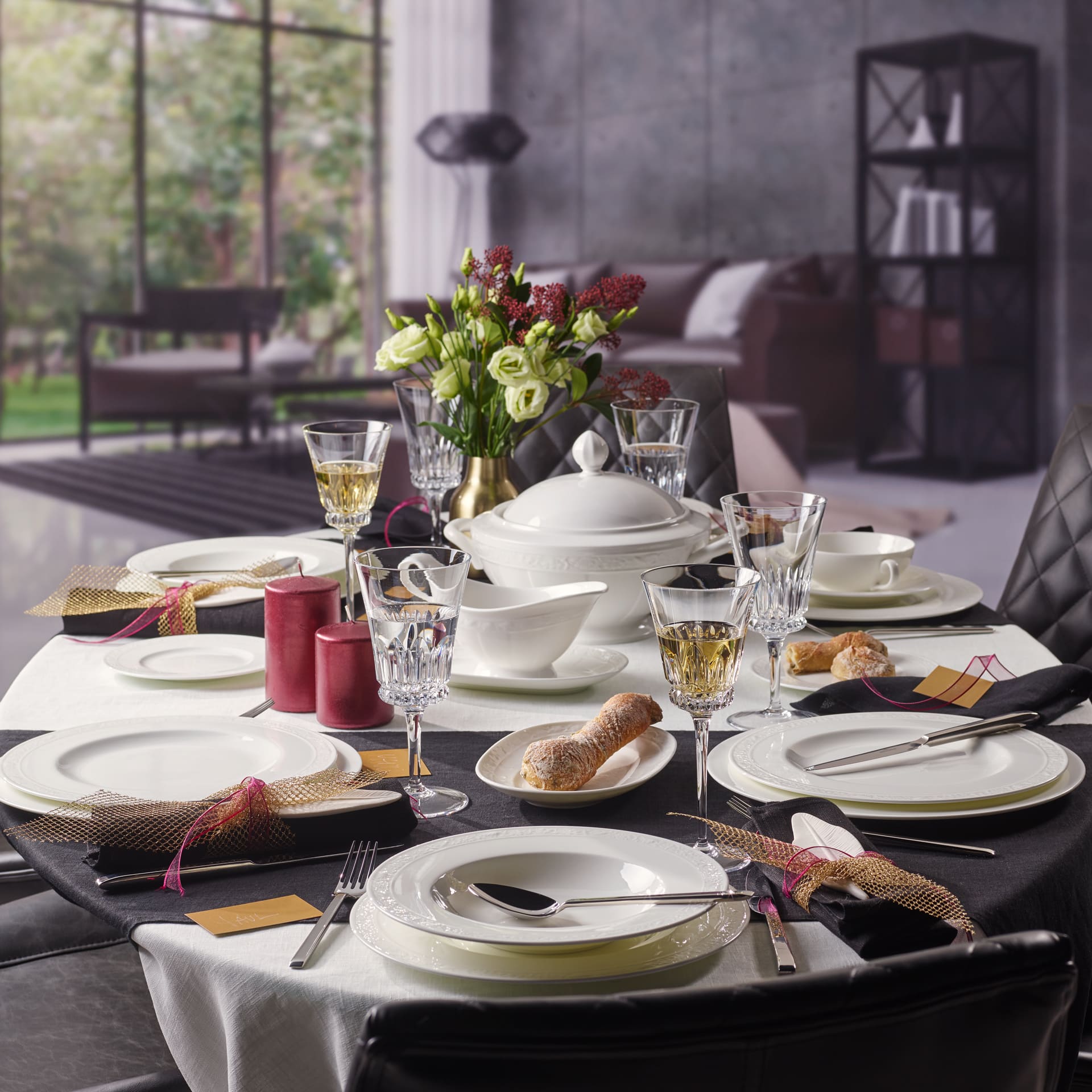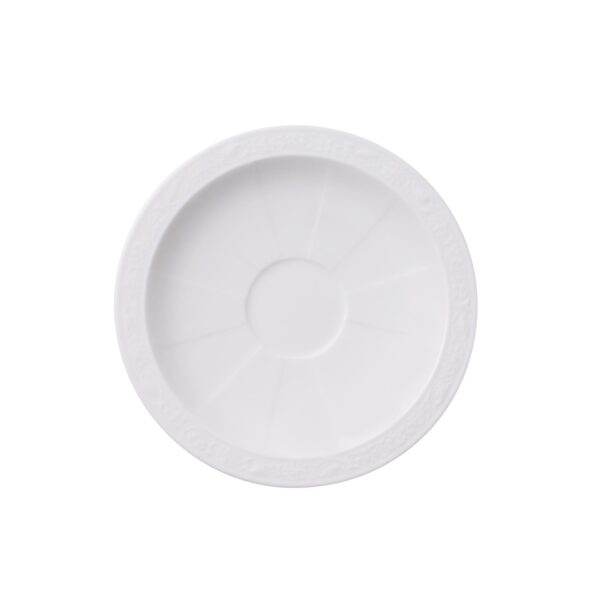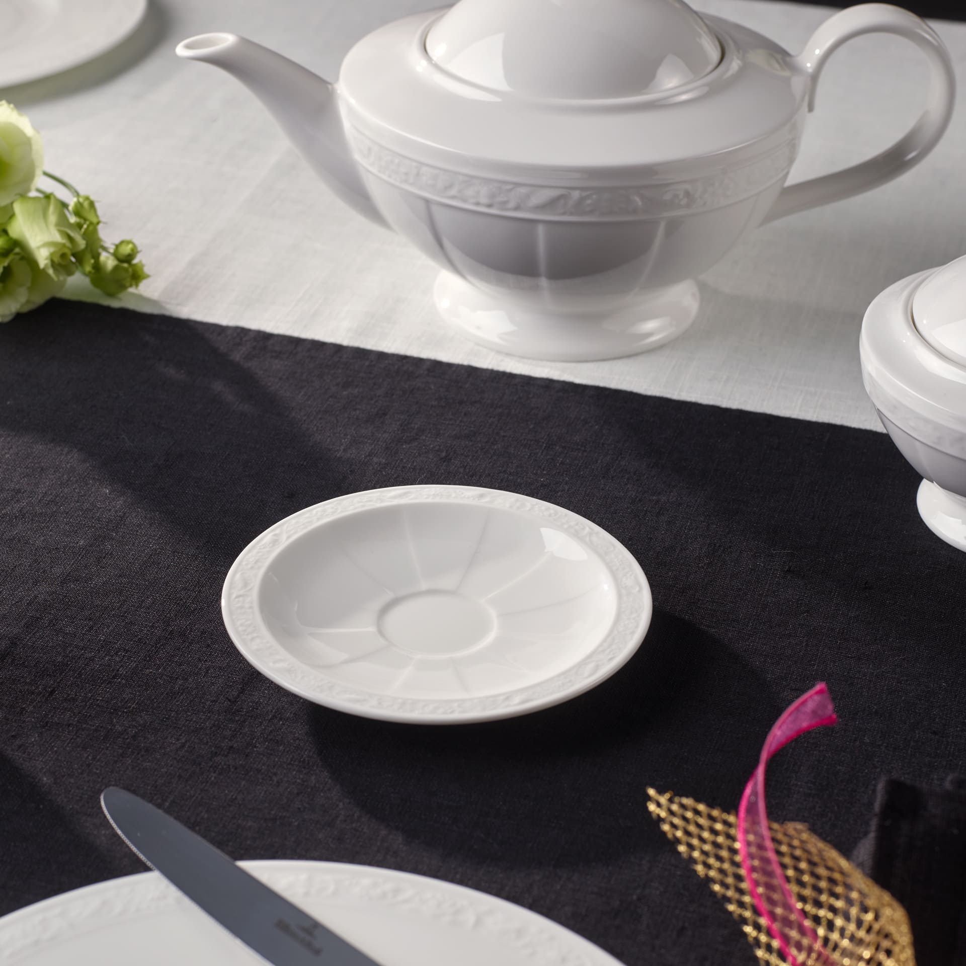 Enjoy strong coffee specialities with Villeroy Boch. Villeroy Boch offers delicate porcelain crockery in a classic design with its White Pearl. The gleaming white and the subtle decorations underscore the elegant character of the collection. This refined saucer gives you the perfect foundation for original Italian espresso pleasure. Create an elegant atmosphere with this saucer while drinking espresso.