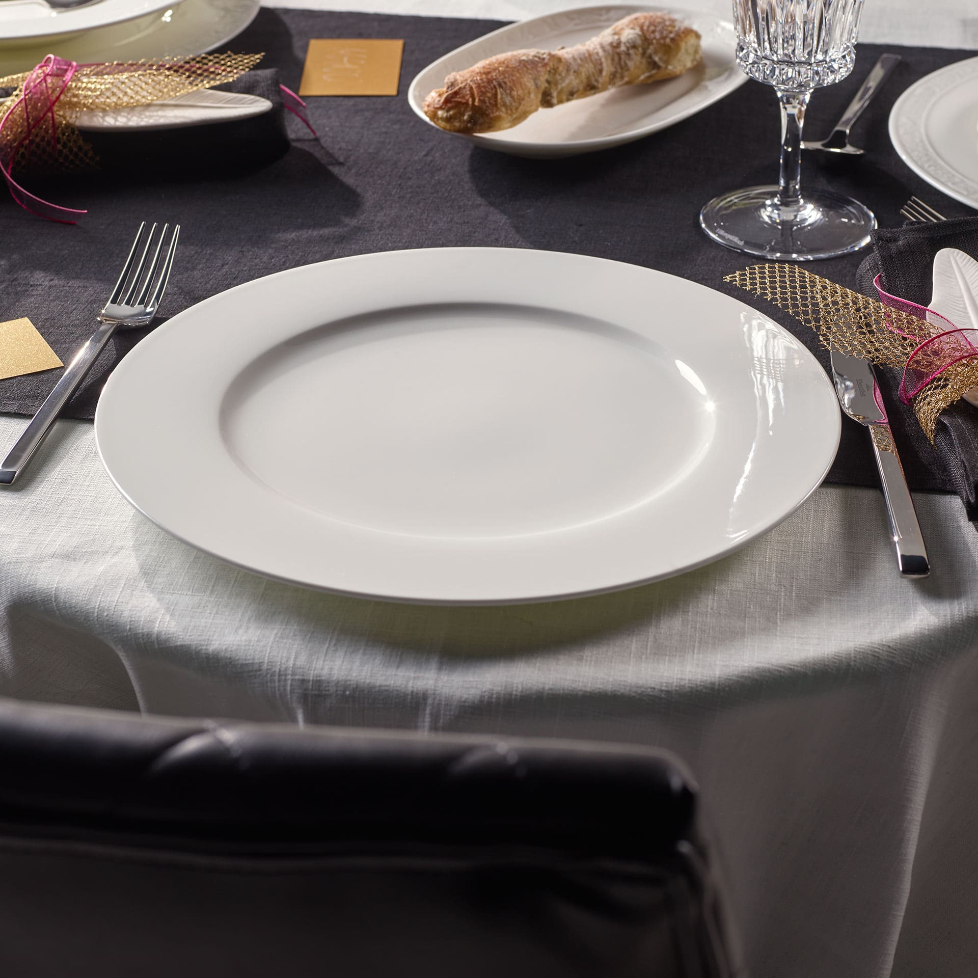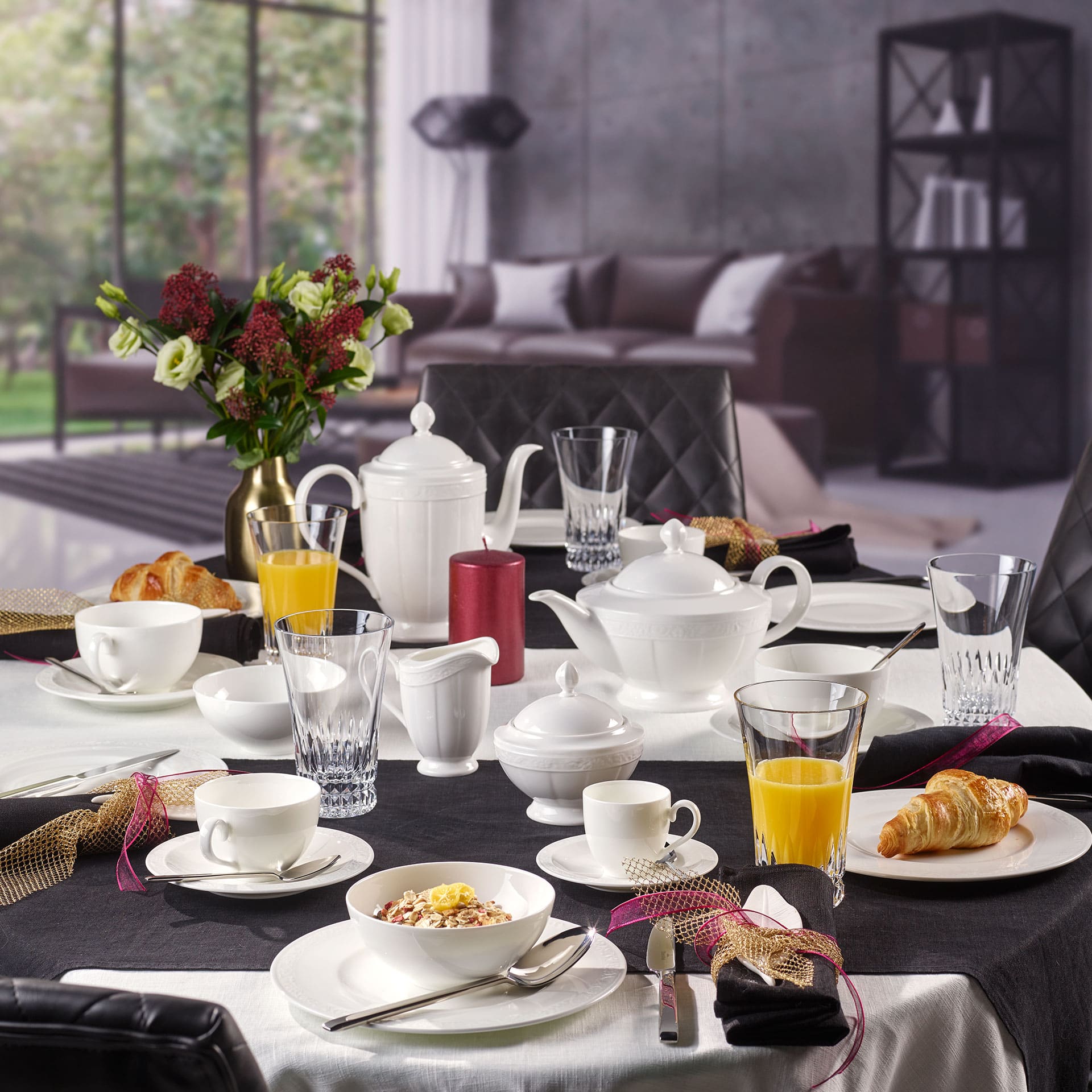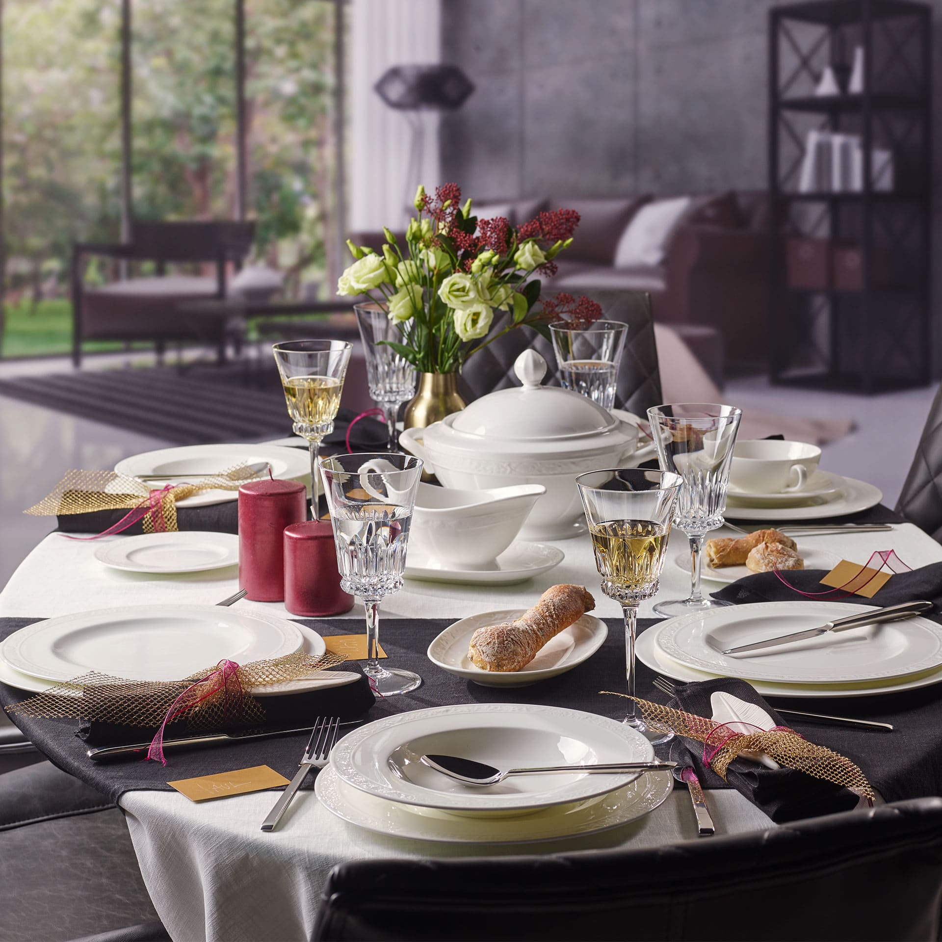 Villeroy Boch offers delicate porcelain crockery in a classic design with its White Pearl. The gleaming white and the subtle decorations underscore the elegant character of the collection. Use this classily designed gourmet plate for special treats or as an underplate for a multi-course festive meal.