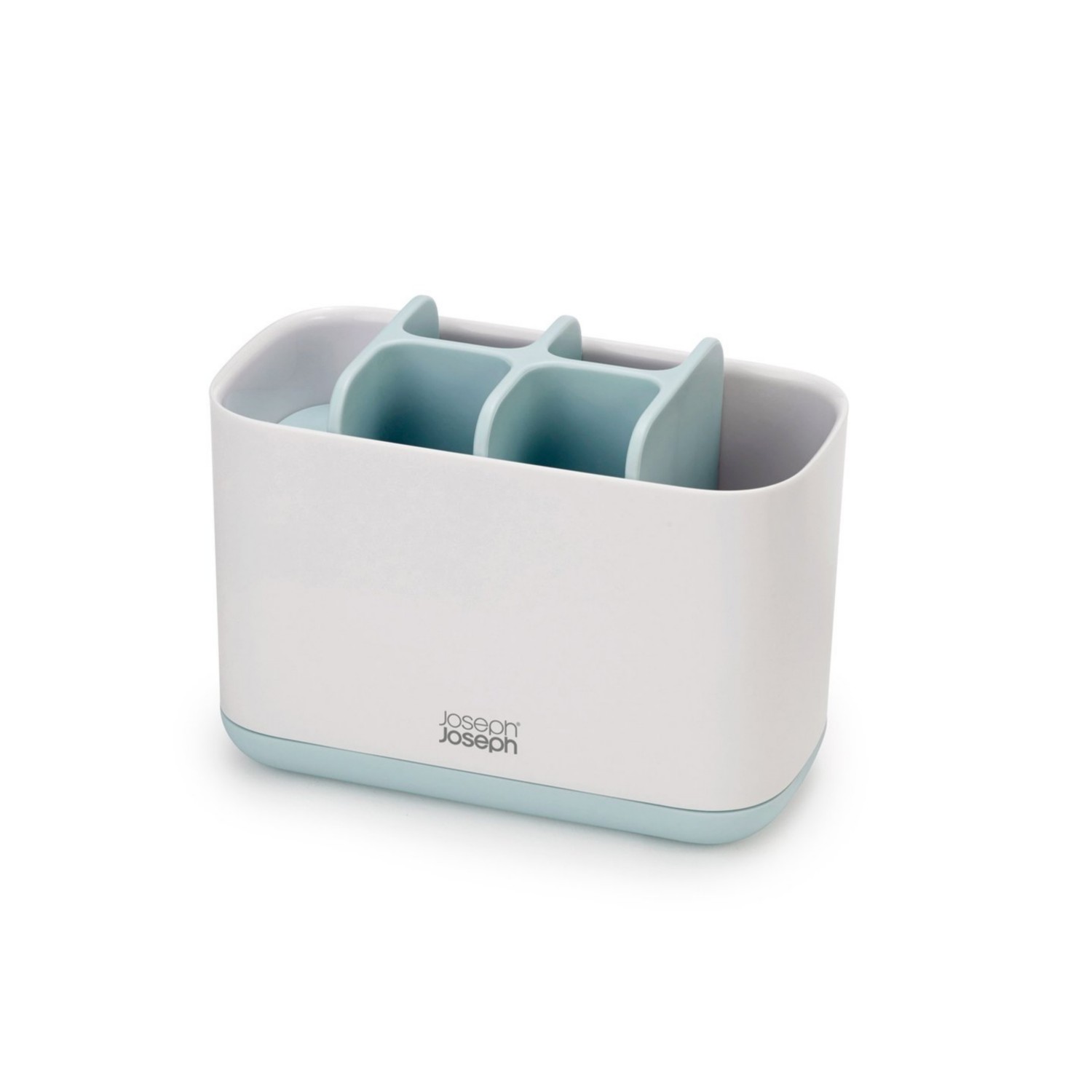 These toothbrush caddies have different sections for organising a variety of oral care items such as manual or electric toothbrushes and toothpaste tubes.