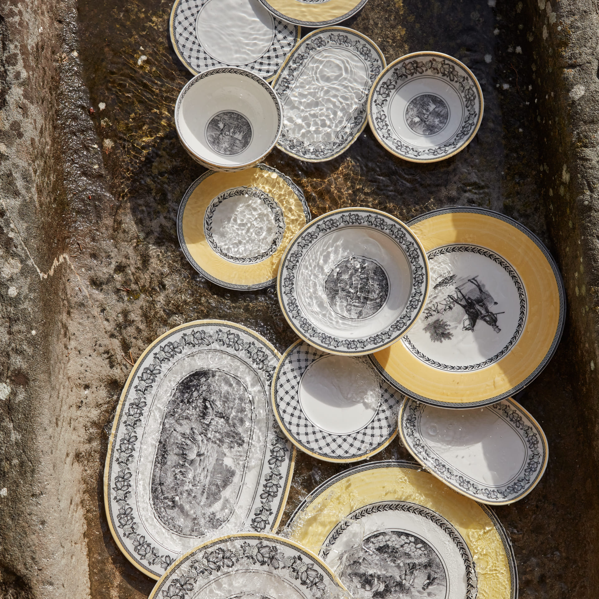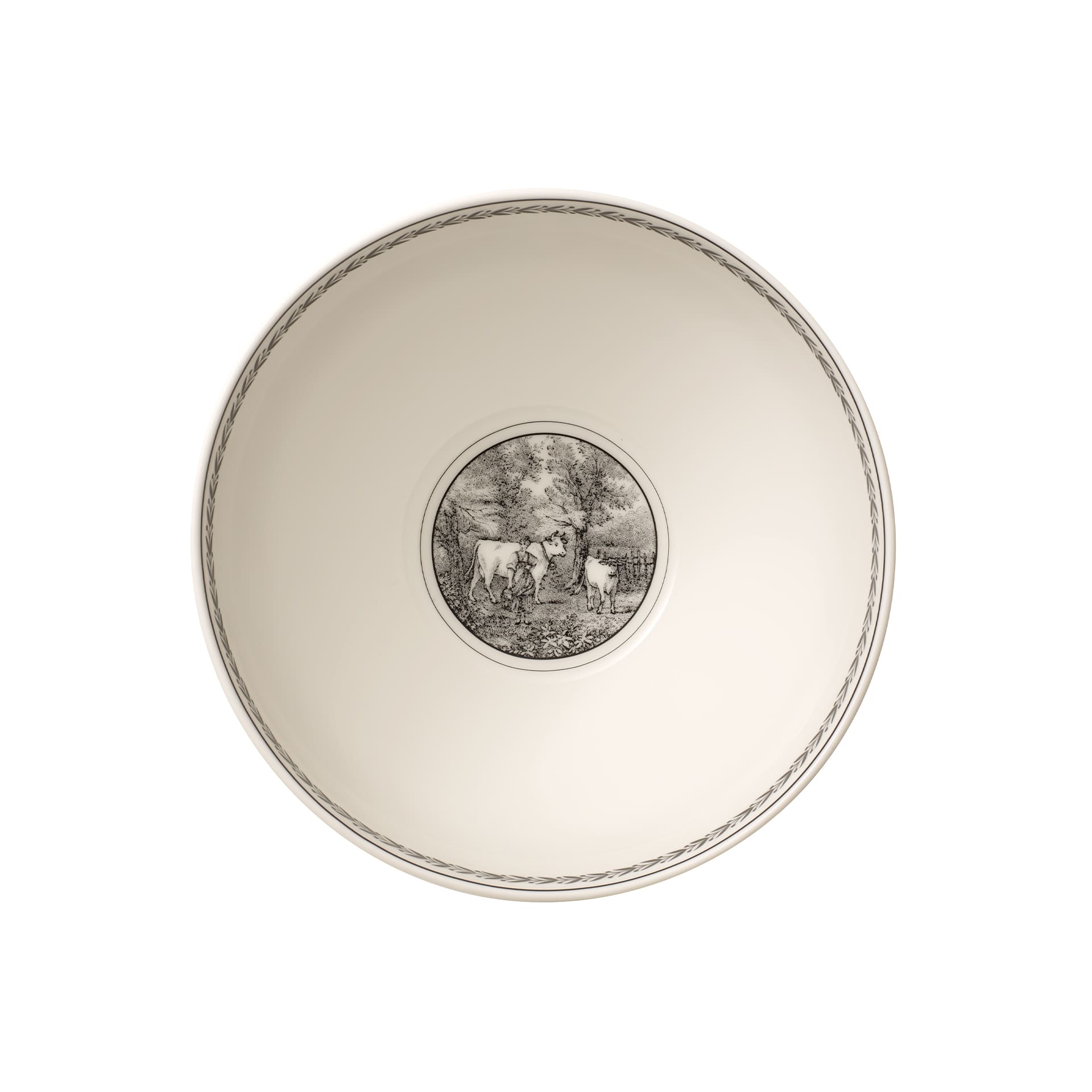 This salad bowl forms part of Villeroy Bochs country style pattern Audun Ferme. With this pattern Villeroy Boch exquisitely bridges past, present and future inspired by copper engraved designs from the turn of the last century. Pastoral scenes in black and white have been freshened up by a creamy yellow accent border and other graphic ornamentations. 4 patterns together yield a strong fashion statement to dress up your table or hang decorative plates on the wall. The 4 ranges are: Femme, Promenade, Fleur and Chase. Audun is a small village in what is now the Lorraine Provence of France and was the first pottery set up by the Boch members of the family.