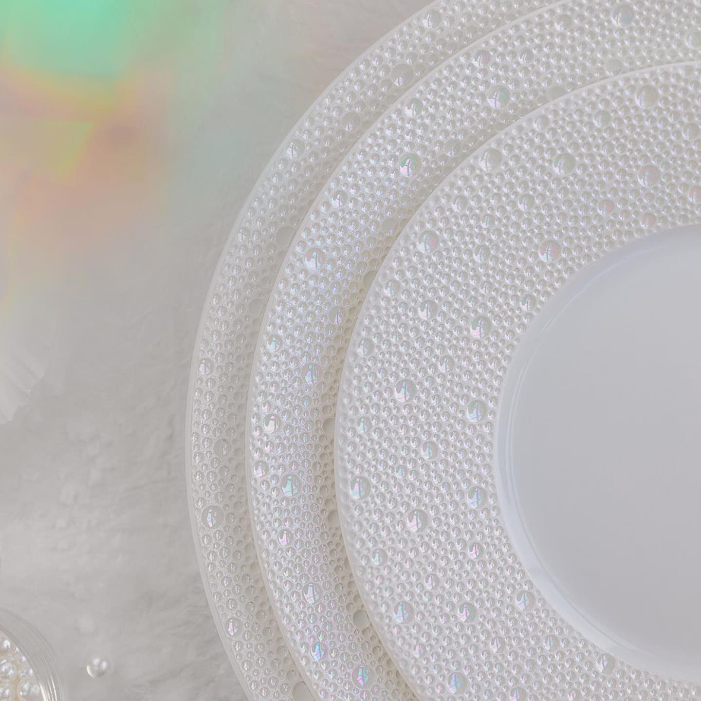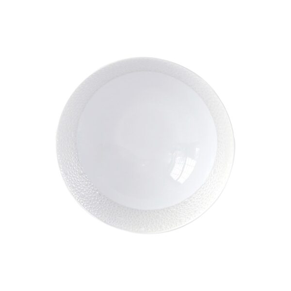 Écume Perle cereal bowl. This piece is used for breakfast to enjoy, milk, cereal and hot chocolate. Subtle effects within the material, masterful glazing work, the hollow engraving of Écume makes for a contemporary and poetic collection that produces a highly elegant and modern table setting.