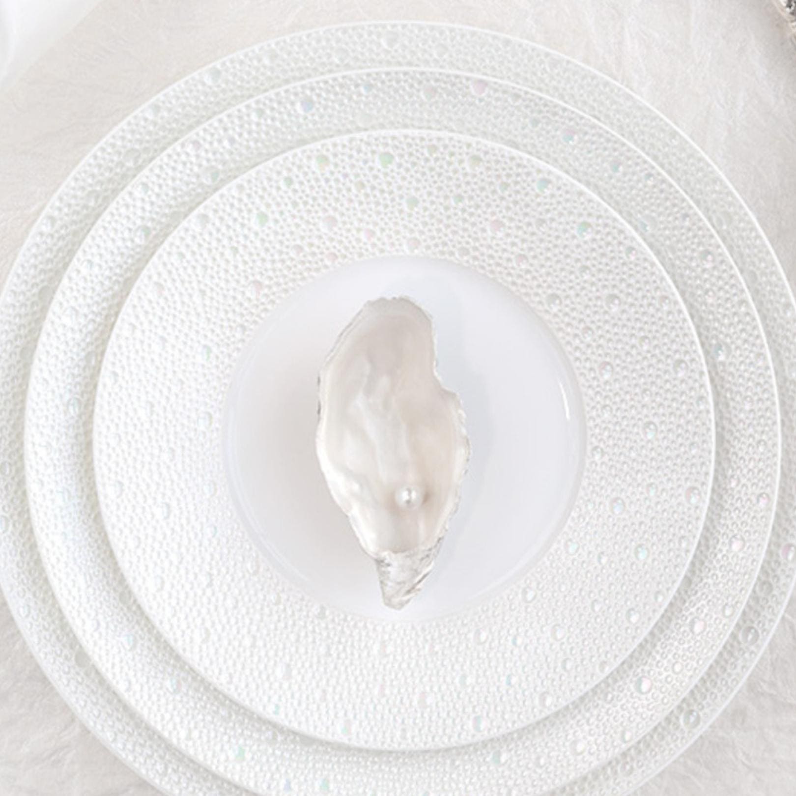 The Écume Perle collection features modern texture with a subtle mother-of-pearl finish. The delicate finish offers a soft iridescent shimmer. While the hollow engraving along the rim gives these pieces a contemporary poetic effect.