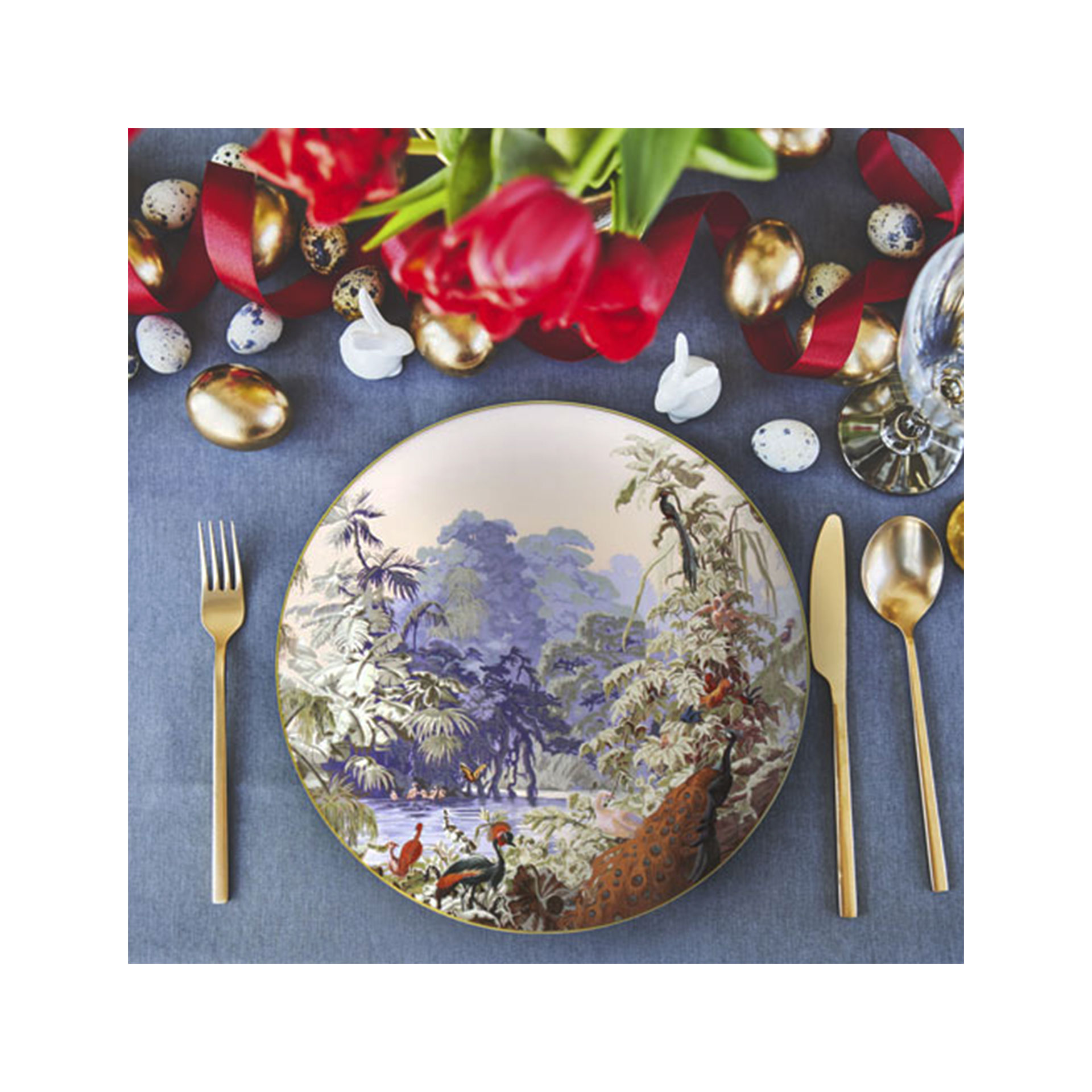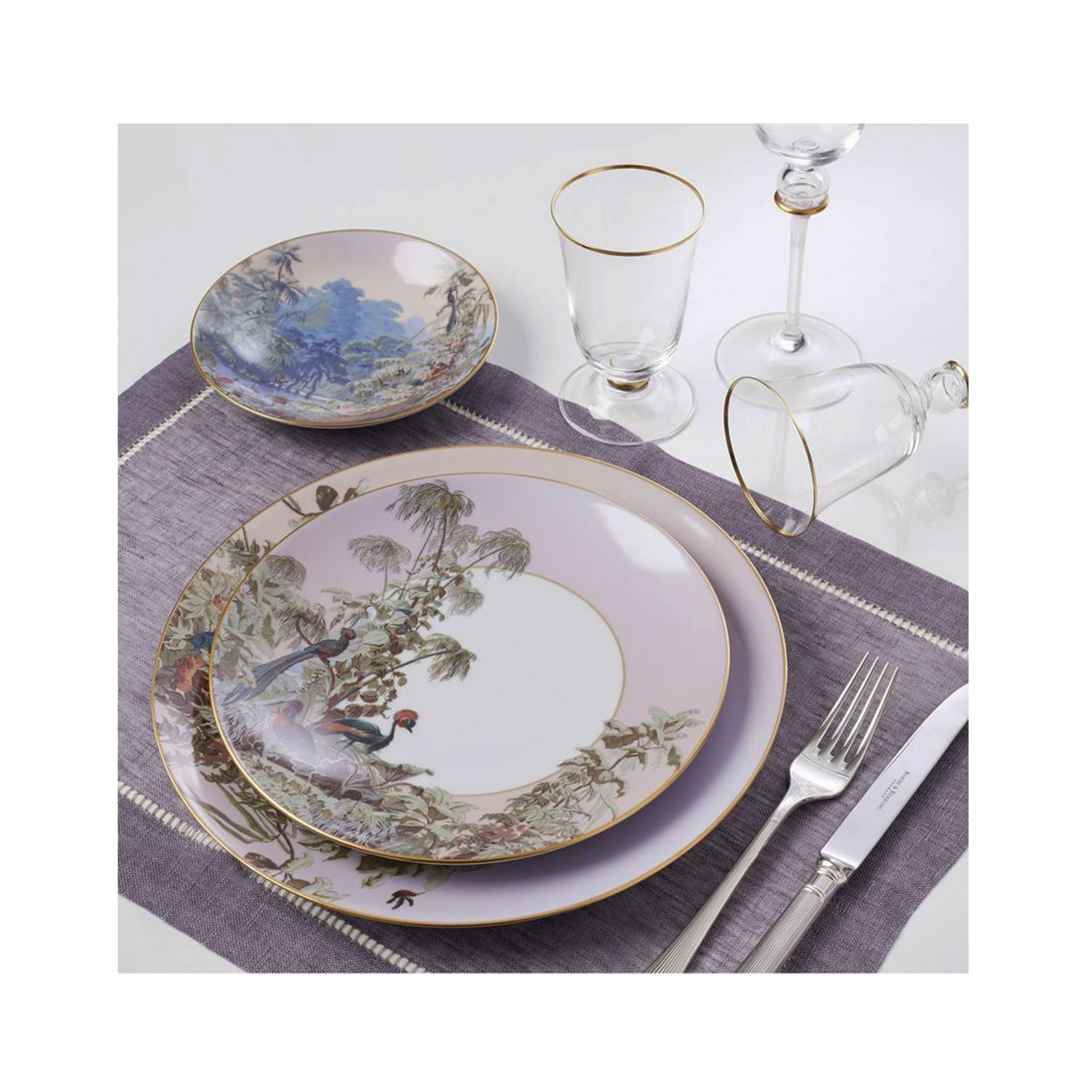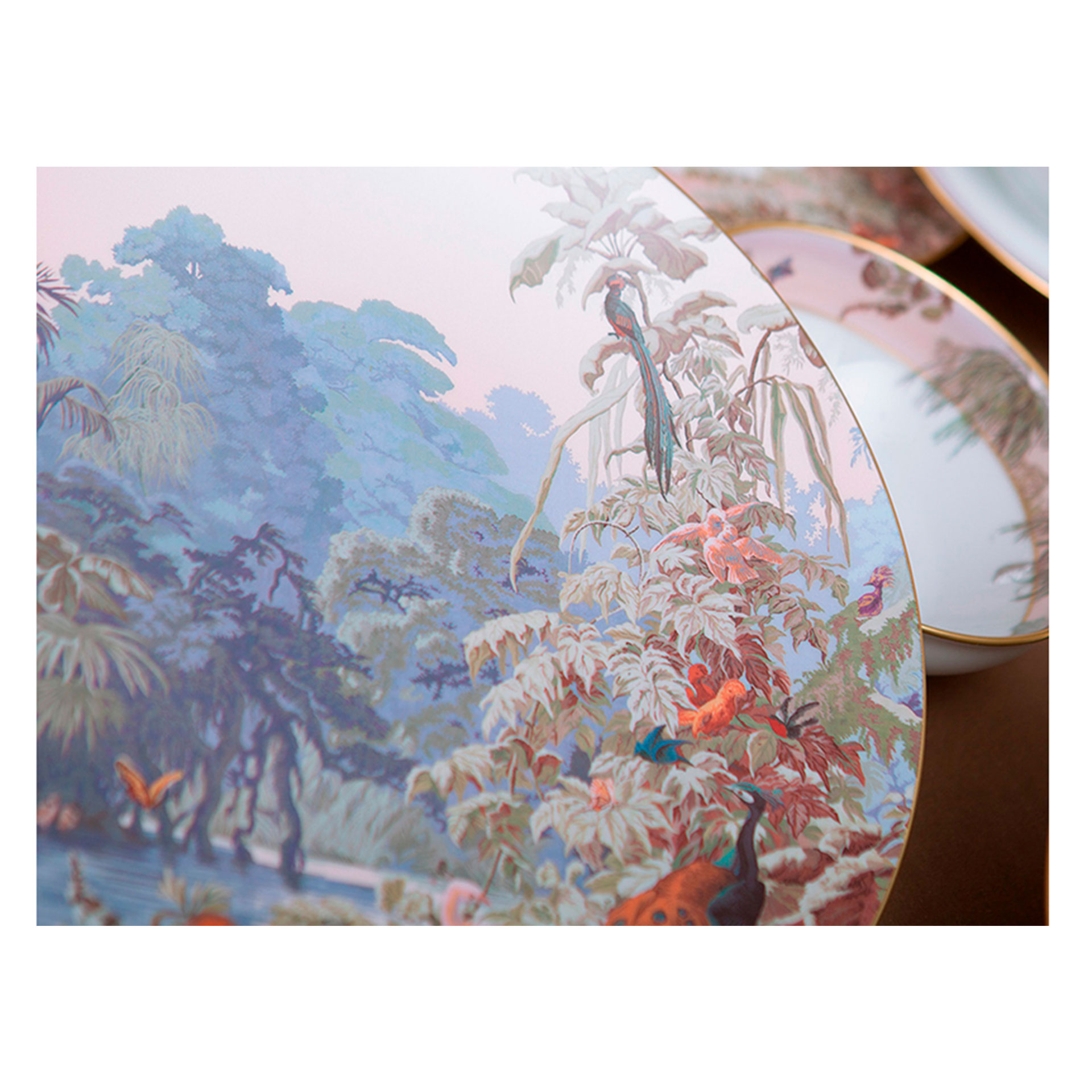 The Le Brésil dinnerware is made of Limoges porcelain and was conceived in 2013 thanks to the collaboration between the porcelain manufacturer Haviland and another French manufacturer, Zuber. Zuber produces high-quality wallpaper, fabrics and murals with superb motifs. The teamwork and expertise of these two successful French manufacturers have produced this exquisite porcelain service.