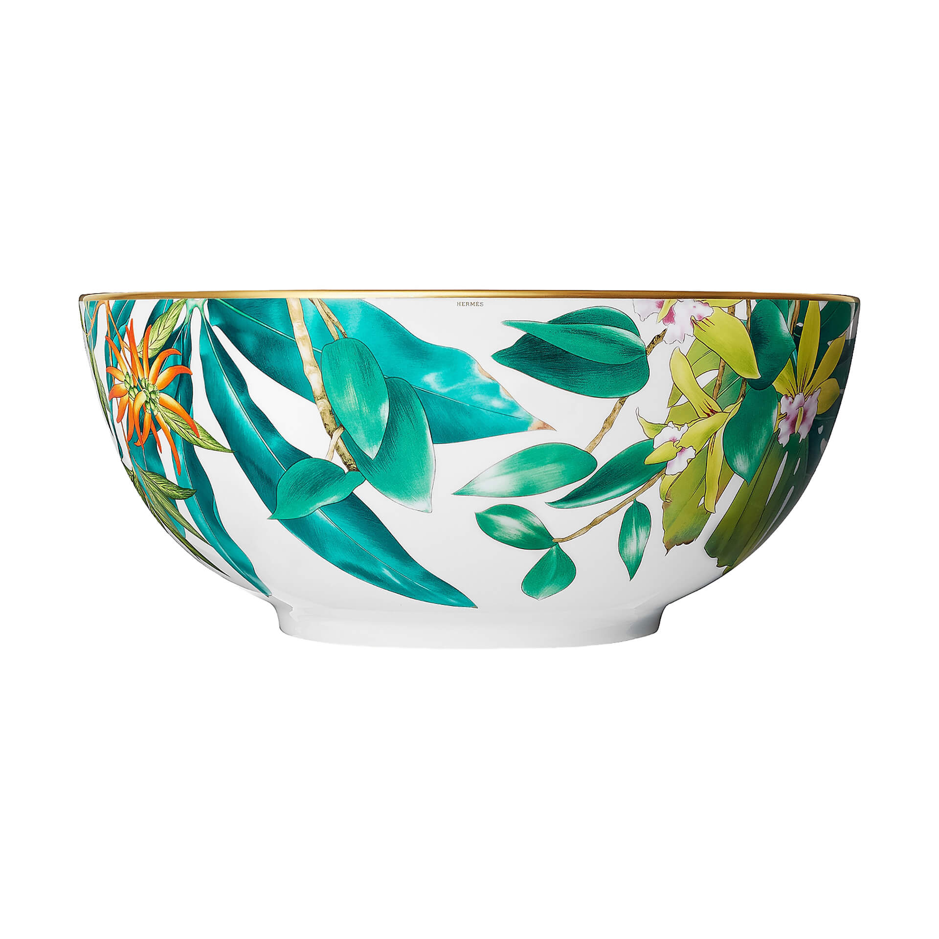 Salad bowl from Passifolia collection. Nathalie Rolland-Huckel designed Passifolia, the tableware collection by Hermès, between two worlds, at the threshold between botanical tradition and art. Drawn from nature, her designs reveal delicate authenticity. From the side plates to the presentation platters, the coffee cups to the dinner plates, the thirty pieces that make up the Passifolia tableware collection are the fruit of an artisanal adventure, an exploration of know-how by the house of Hermès. New techniques and a series of skills were developed to faithfully reproduce the artist’s lush tropical palette and the delicacy of her line.