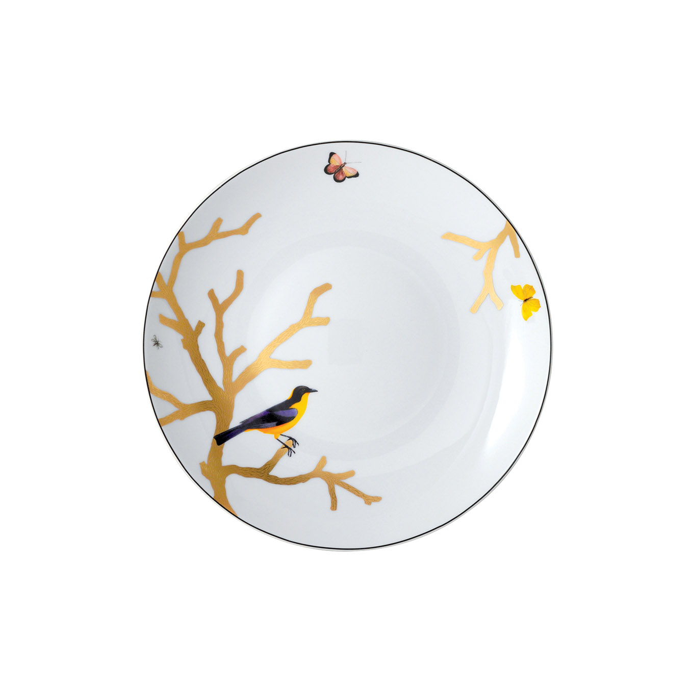 Deep round dish from Aux Oiseaux collection. Inspired by the curiosity cabinets that were so fashionable in the 16th and 17th centuries, the pattern is available on a full dinnerware service with scenes reminiscent of japanese prints: birds depicted in automnal colors perch on stylised trees in raised gold.