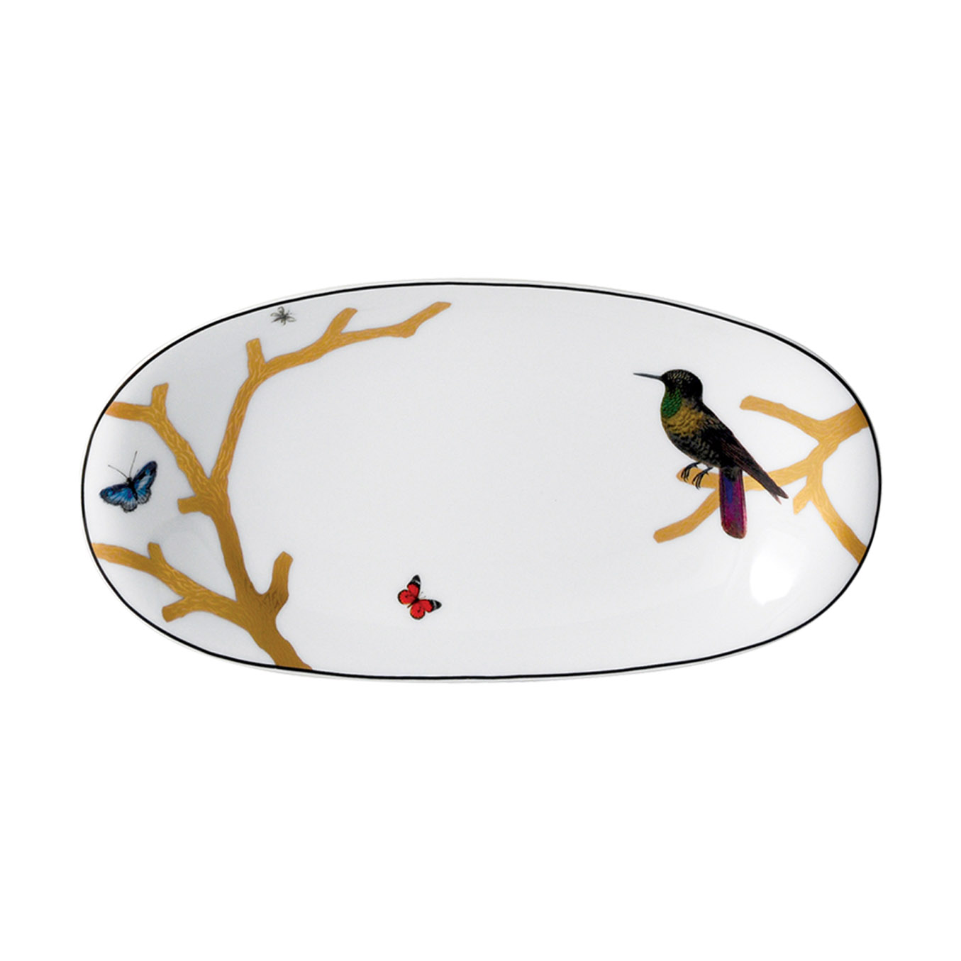Relish dish from Aux Oiseaux collection. Inspired by the curiosity cabinets that were so fashionable in the 16th and 17th centuries, the pattern is available on a full dinnerware service with scenes reminiscent of japanese prints: birds depicted in automnal colors perch on stylised trees in raised gold.