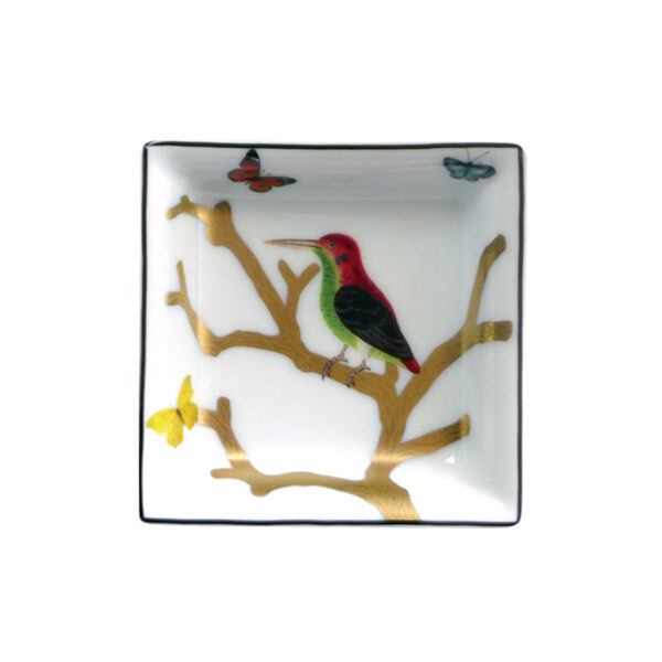 Small square dish from Aux Oiseaux collection. Inspired by the curiosity cabinets that were so fashionable in the 16th and 17th centuries, the pattern is available on a full dinnerware service with scenes reminiscent of japanese prints: birds depicted in automnal colors perch on stylised trees in raised gold.