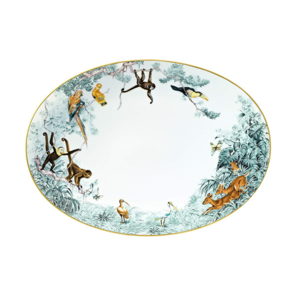 Oval platter from Carnets d’Équateur collection. Jaguars, macaws, panthers and impalas frolic through lush natural settings under the watchful eye of naturalist and painter Robert Dallet. This porcelain collection breathes new life into the full range of the artist’s work, from spontaneous sketches to hyperrealist gouache paintings.