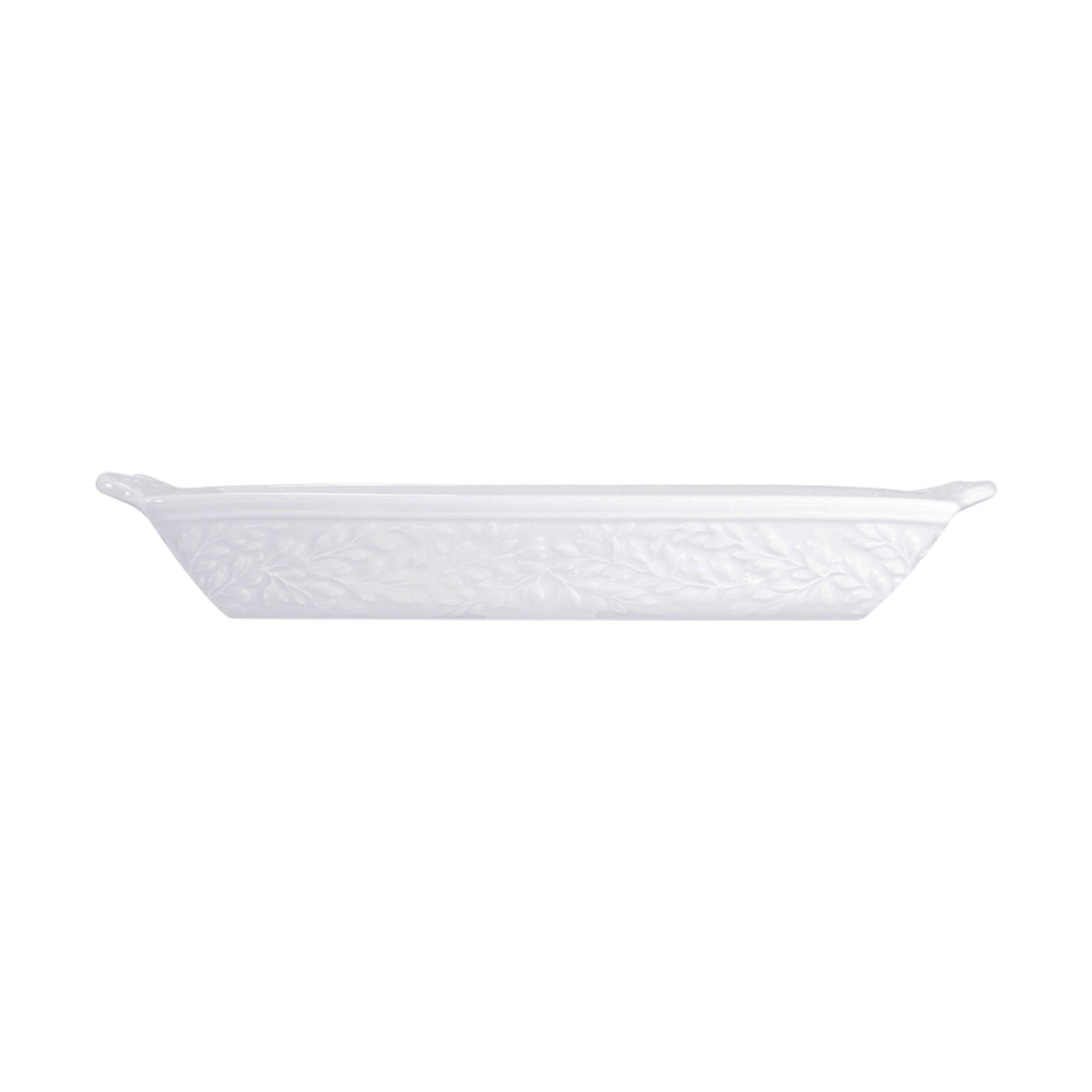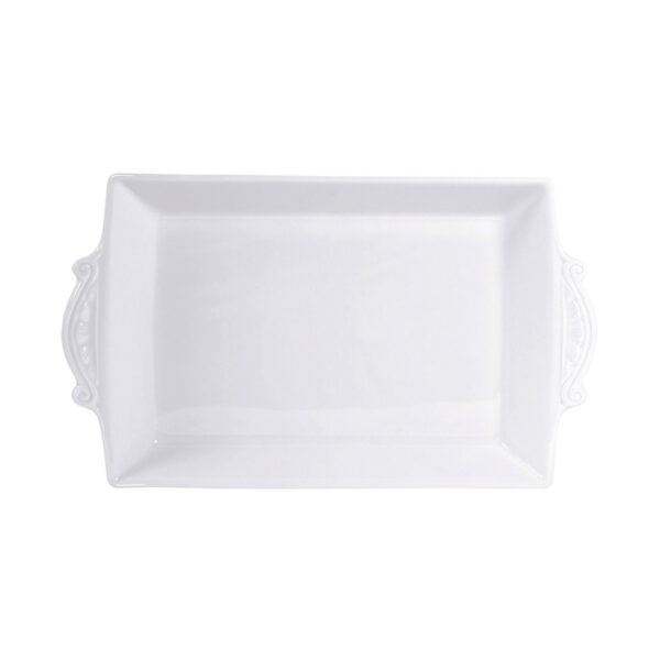 Baker rectangular platter from Louvre collection. The motifs engraved on the pieces that make up this white service create a stylish catalogue detailing the various periods of French architecture from the Renaissance through to the Second Empire which characterize this palace.