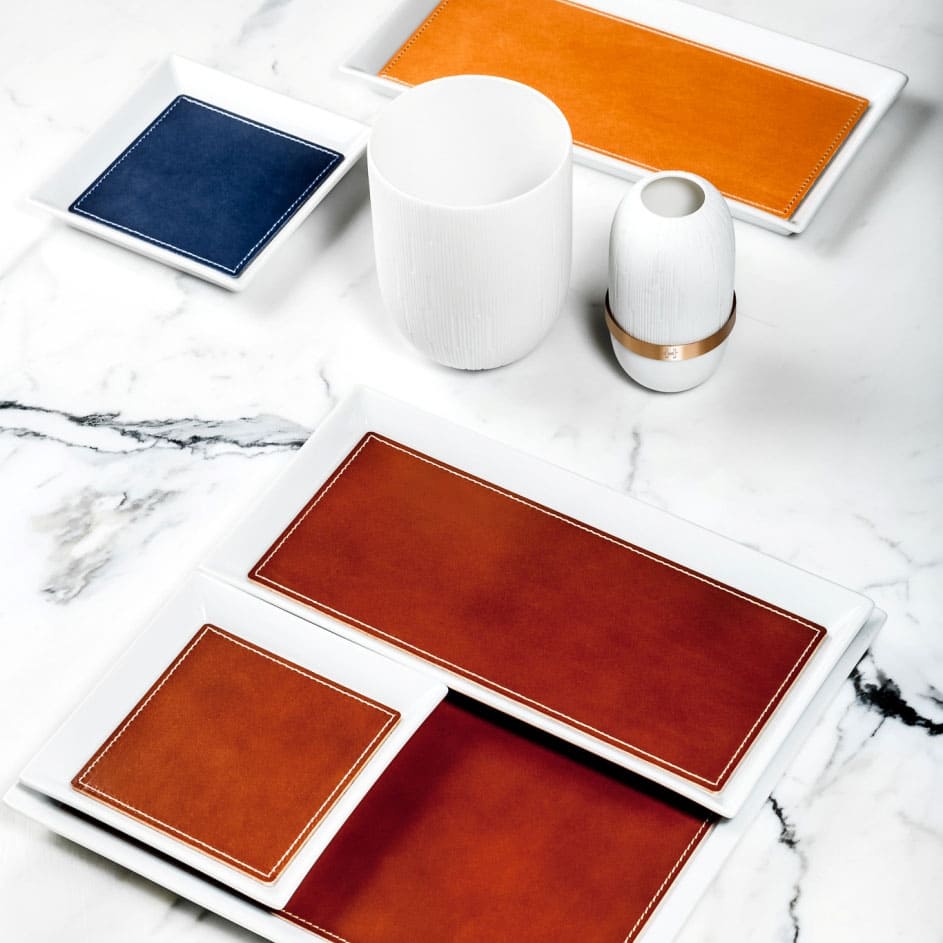 Noces de Cuir Set of 3 trays. Founded in 1842, Haviland has a rich history of combining modern demands with creative craftsmanship. While the quality of their exquisitely hand-finished pieces of Haviland China have been the frequent choice of monarchs, heads of state and homes over many years, that same skill and craftsmanship are evident in their new modern dinnerware designs . Manufactured in the Limoges region of France.