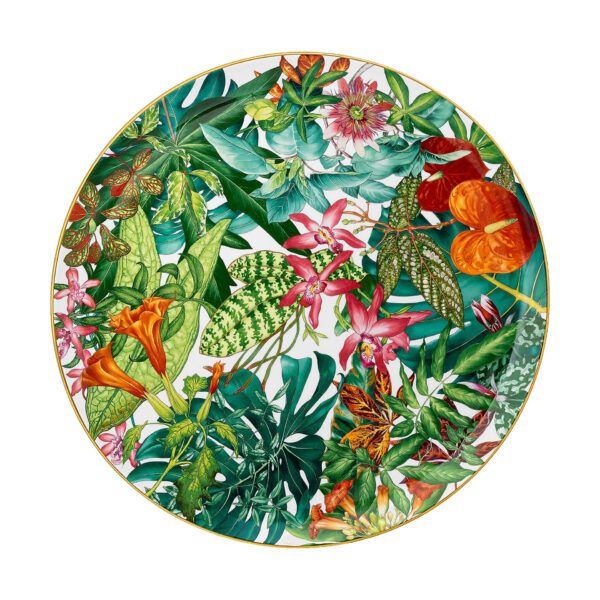 Round platter from Passifolia collection. Nathalie Rolland-Huckel designed Passifolia, the tableware collection by Hermès, between two worlds, at the threshold between botanical tradition and art. Drawn from nature, her designs reveal delicate authenticity. From the side plates to the presentation platters, the coffee cups to the dinner plates, the thirty pieces that make up the Passifolia tableware collection are the fruit of an artisanal adventure, an exploration of know-how by the house of Hermès. New techniques and a series of skills were developed to faithfully reproduce the artist’s lush tropical palette and the delicacy of her line.