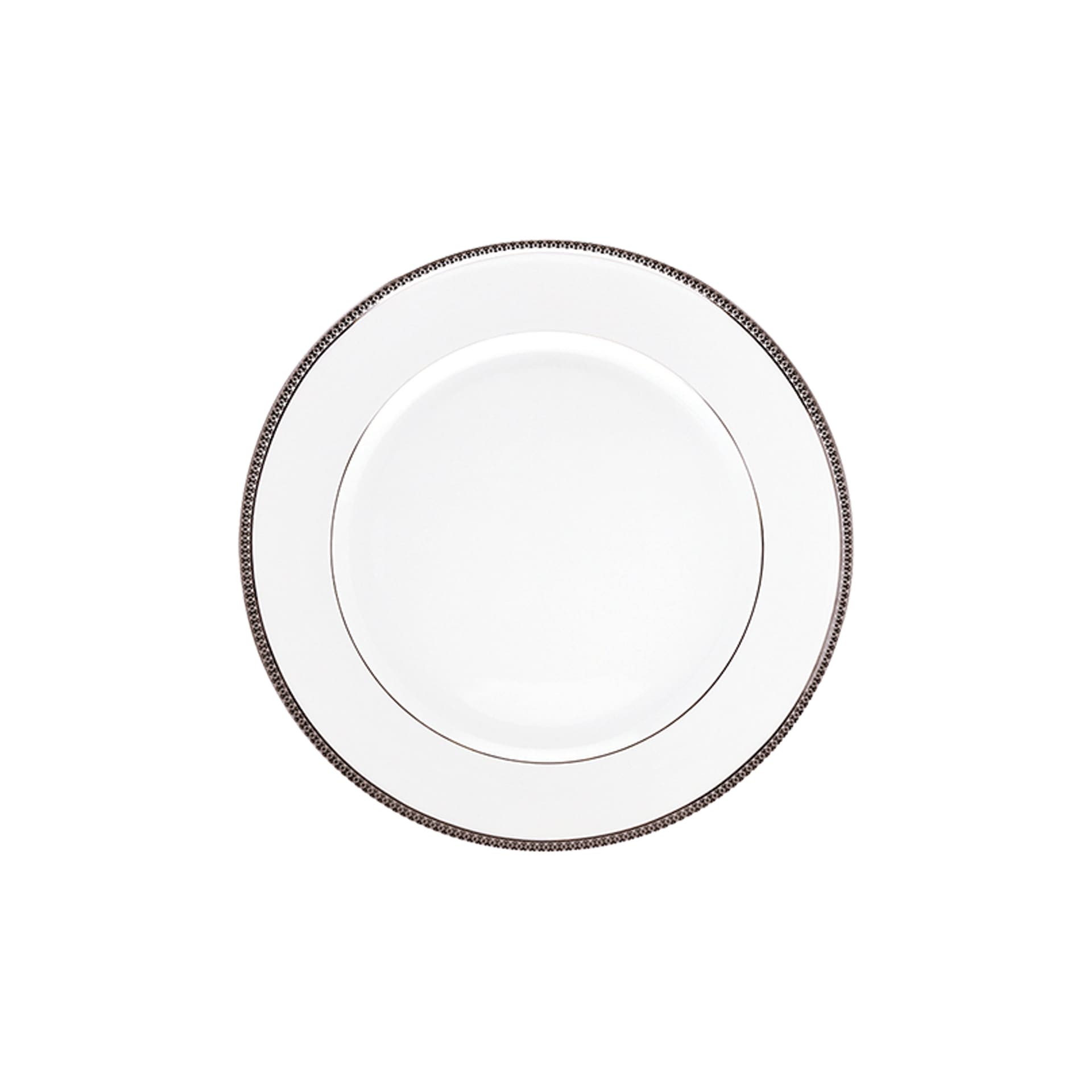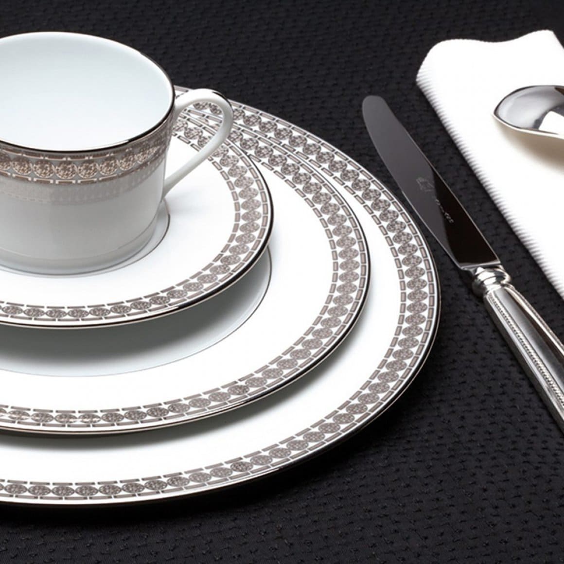 Symphonie Platine Flat dish.The Haviland Symphonie pattern in platine is both contemporary and classic in its simplicity. It is crisp white china edged in an elegant band of black and gold, with a fine platinum ring on the inside. An elegant combination of bold color and rich platine, Symphony Limoges porcelain dinnerware from Haviland is the perfect choice for a stylish and colorful table. Made of Fine Limoges porcelain imported from France.