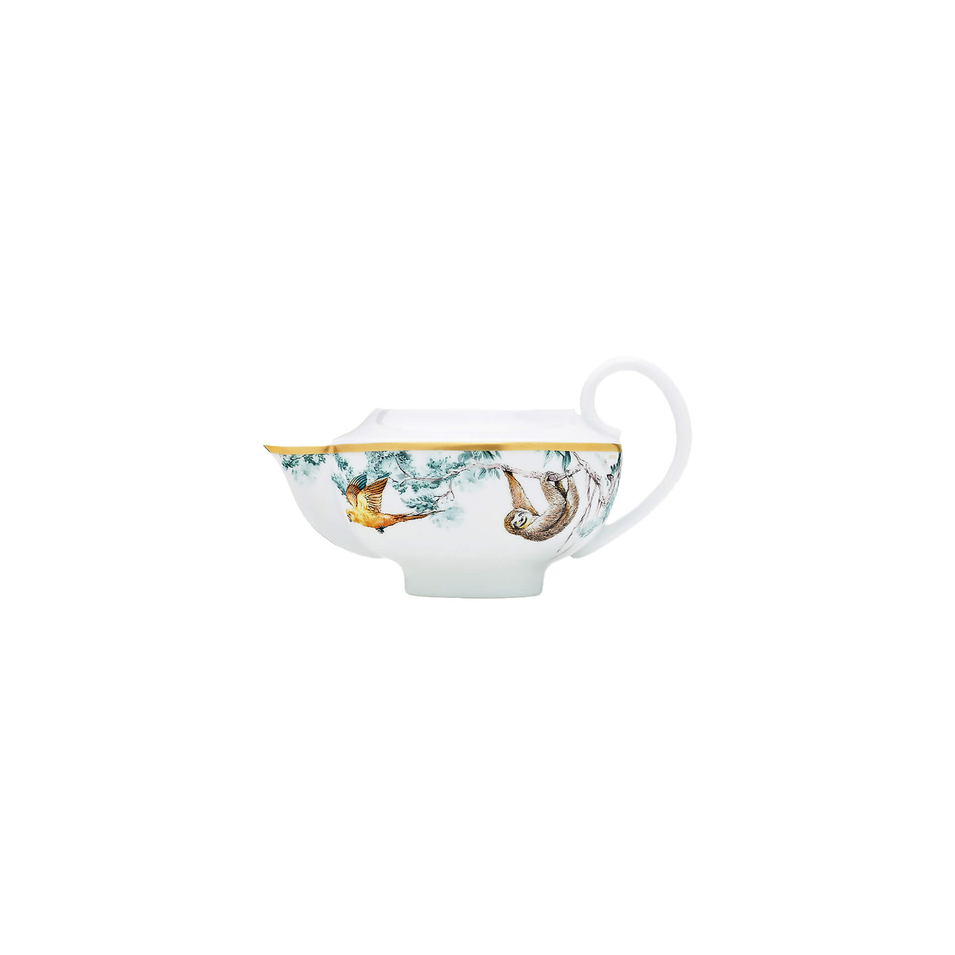 Creamer from Carnets d’Équateur collection. Jaguars, macaws, panthers and impalas frolic through lush natural settings under the watchful eye of naturalist and painter Robert Dallet. This porcelain collection breathes new life into the full range of the artist’s work, from spontaneous sketches to hyperrealist gouache paintings.