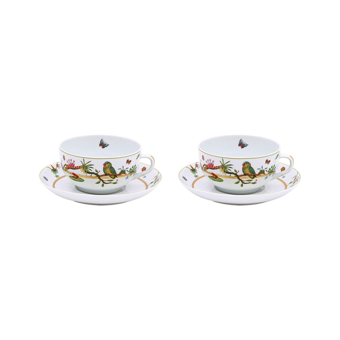 Alain Thomas Cappuccino cup saucer set of 2. The Alain Thomas dinner service from Haviland is brightly decorated with parrots, butterflies, plants and orchids. French artist Alain Thomas painted this tropical world. With its rich choice of motifs and intensive colours, the high-quality Alain Thomas dinner service from Haviland is a masterpiece, on which there is always something new to discover. It recounts a story – only not, as is usual, on paper, but on high-quality Limoges porcelain.