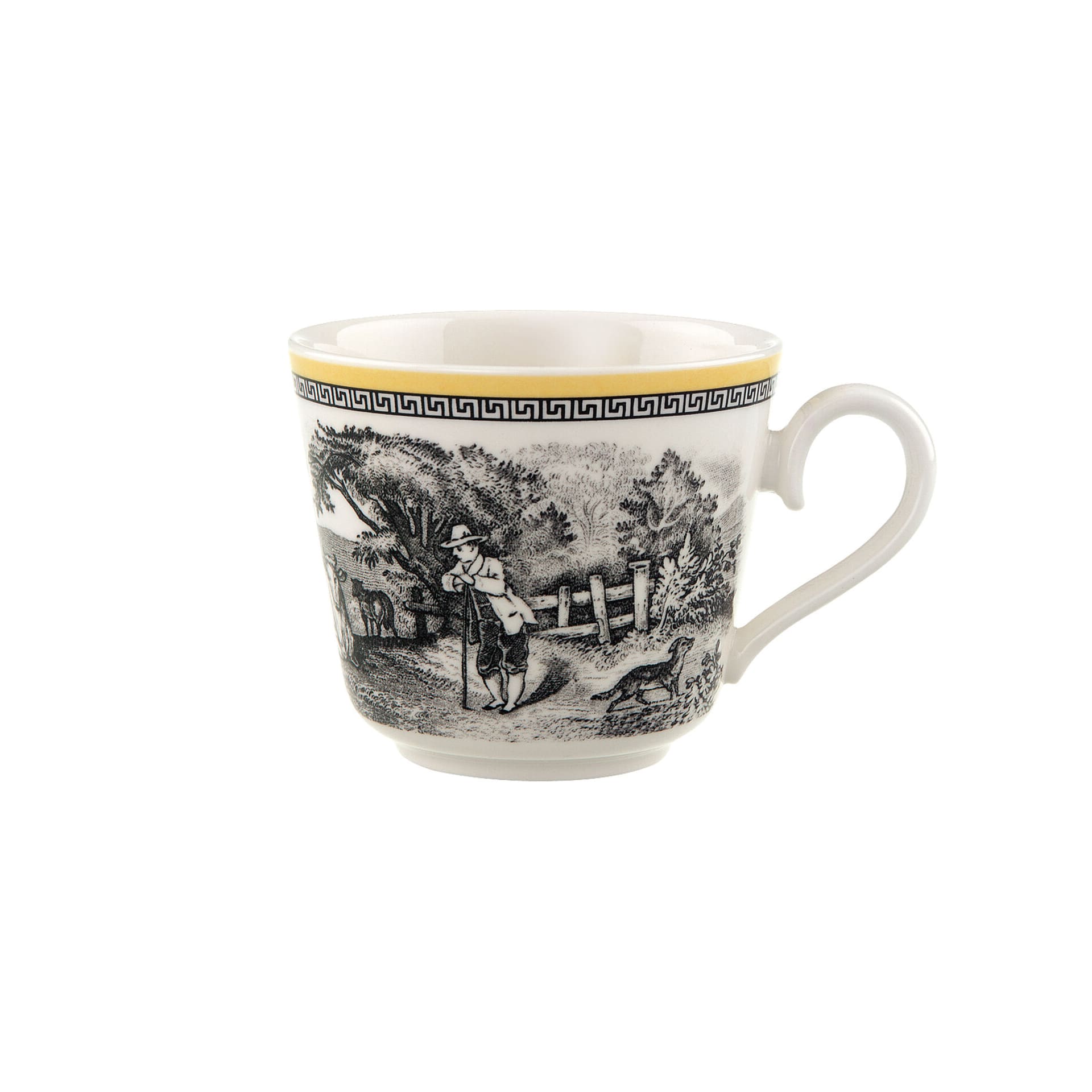 This Coffee / tea cup forms part of Villeroy Bochs country style pattern Audun Ferme. With this pattern Villeroy Boch exquisitely bridges past, present and future inspired by copper engraved designs from the turn of the last century. Pastoral scenes in black and white have been freshened up by a creamy yellow accent border and other graphic ornamentations. 4 patterns together yield a strong fashion statement to dress up your table or hang decorative plates on the wall. The 4 ranges are: Femme, Promenade, Fleur and Chase. Audun is a small village in what is now the Lorraine Provence of France and was the first pottery set up by the Boch members of the family.
