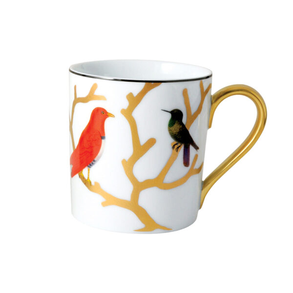 Mug from Aux Oiseaux collection. Inspired by the curiosity cabinets that were so fashionable in the 16th and 17th centuries, the pattern is available on a full dinnerware service with scenes reminiscent of japanese prints: birds depicted in automnal colors perch on stylised trees in raised gold.