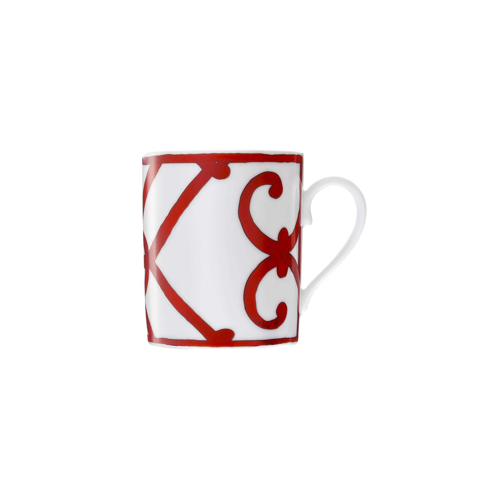 Mug №2 from Balcon du Guadalquivir collection. The graphic, bold scenery recalls the ironwork of Andalusian towns. The sturdiness of the drawing, the vitality of the colour red, and the wealth and variety of the pieces make it a noble table service.