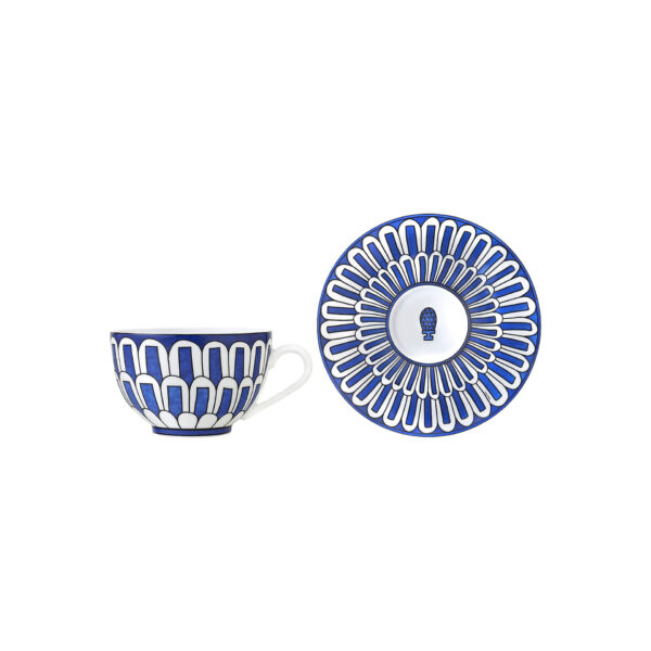 Tea cup and saucer from Bleus d’Ailleurs collection. A contemporary take on the traditional blue and white sets that evoke dream-like, faraway lands. Their characteristic motifs have been reworked in a geometrical, modern style in several shades of blue outlined in black, offset with a titillating touch of bright yellow.
