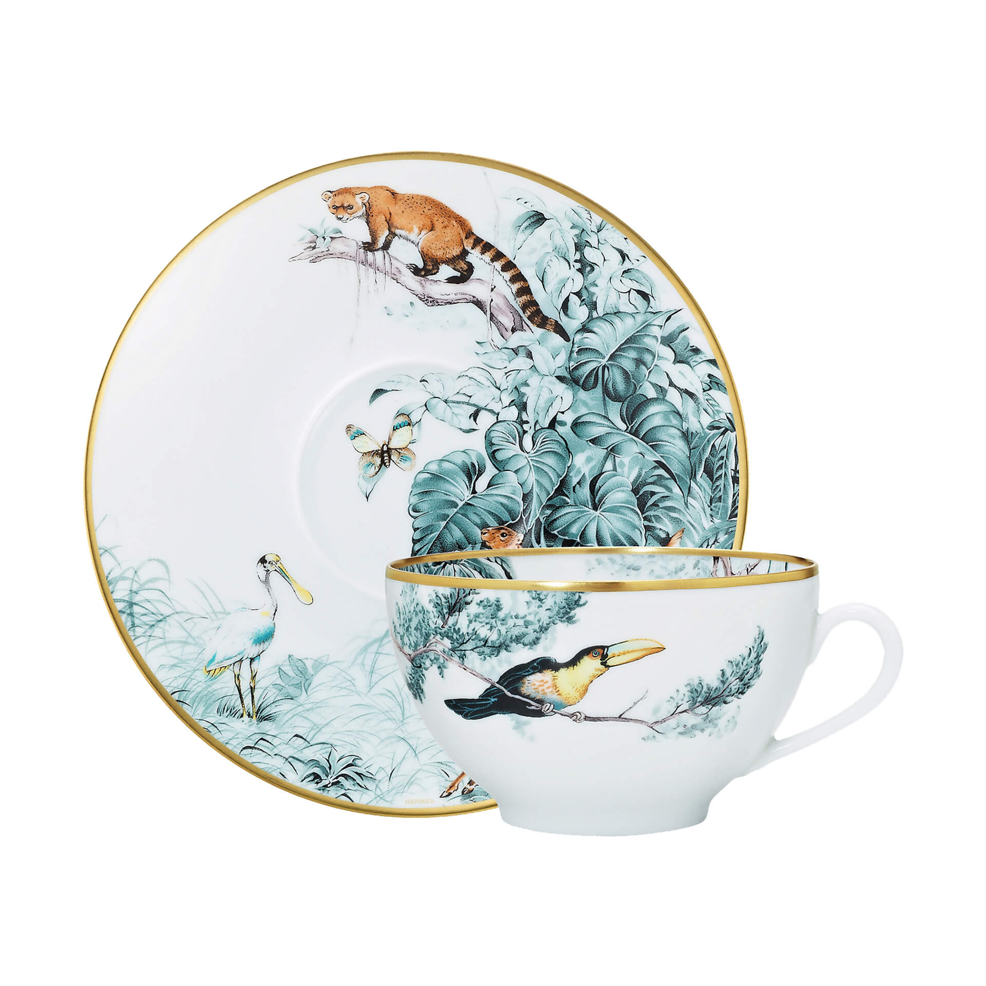 Breakfast cup and saucer from Carnets d’Équateur collection. Jaguars, macaws, panthers and impalas frolic through lush natural settings under the watchful eye of naturalist and painter Robert Dallet. This porcelain collection breathes new life into the full range of the artist’s work, from spontaneous sketches to hyperrealist gouache paintings.