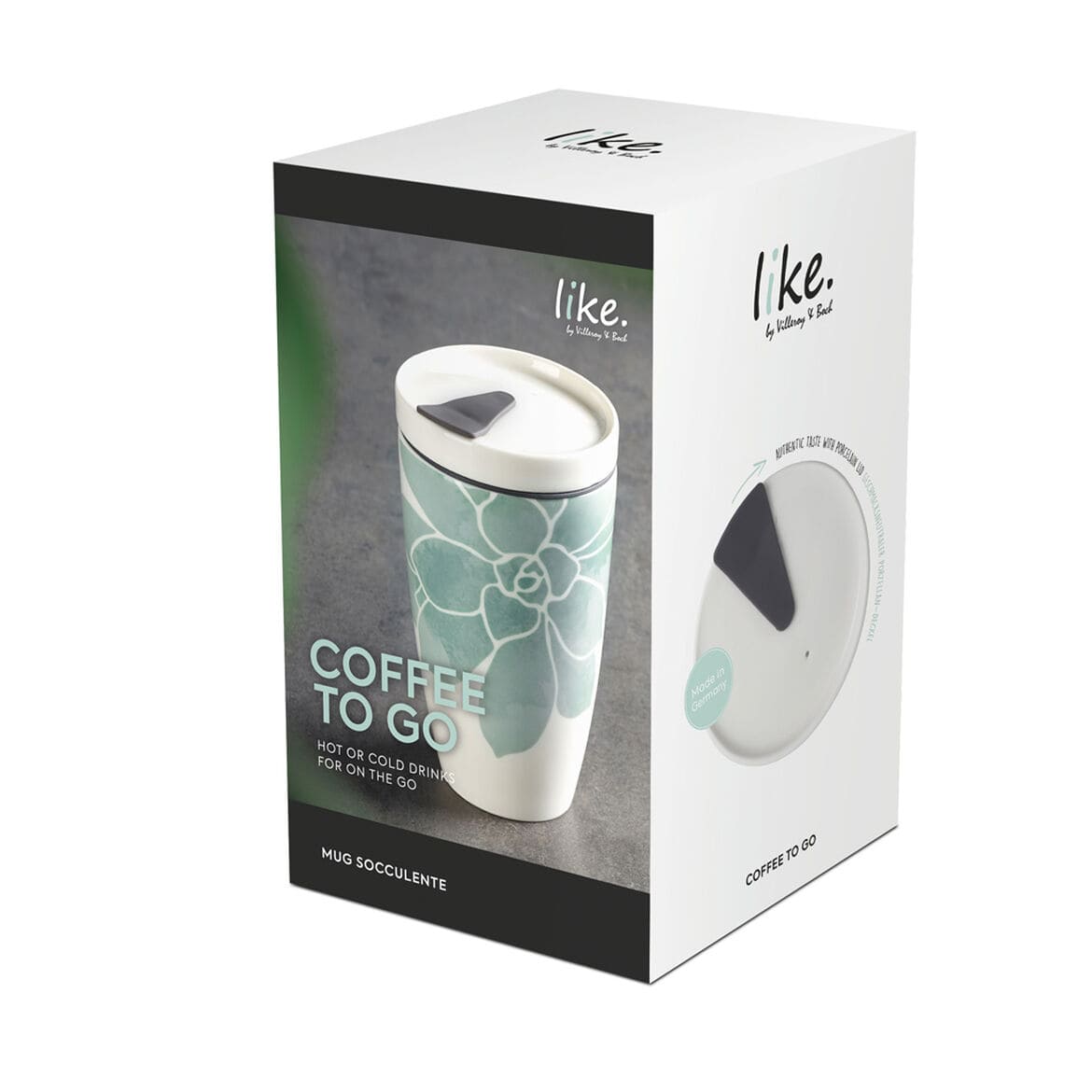 Sustainability on the go. To Go is the collection for anyone who enjoys being on the go and wants to eat healthy yet still avoid plastic. The porcelain mugs and leakproof bowls keep your food fresh and tasty all day long. You can always take your favourite hot or cold drink with you in the practical travel coffee mug with a stylish succulent Home decor. No more dripping thanks to the silicone seal and the sleeve protects your hand from heat. Made from high-quality Premium Porcelain. Naturally suitable for the dishwasher and microwave. Enjoy your coffee sustainably and plastic-free even when youre on the move.