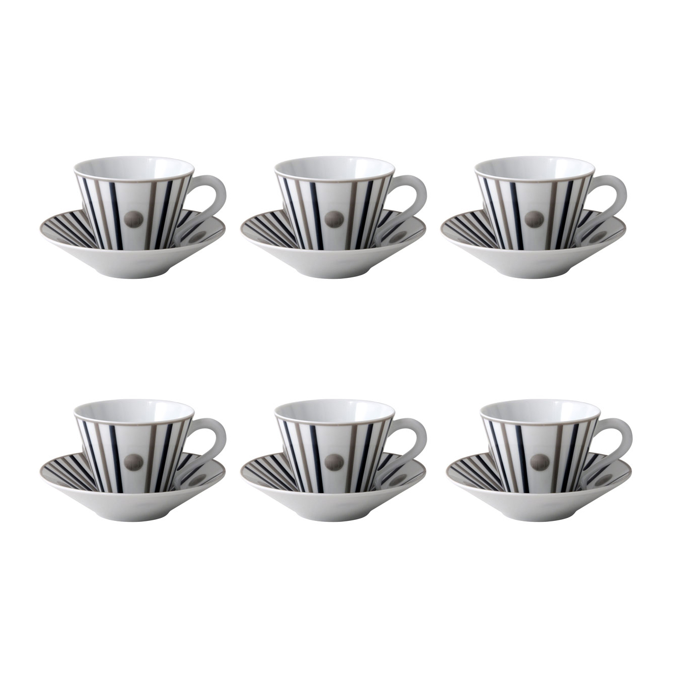 Delos Grege tea cup and saucer set of 6. The Délos series, designed by the artist and decorator Olivier Gagnier for Bernardaud, features classic Home decor with two-tone stripes and austere bas-reliefs. The collection is made of fine porcelain and is available in two colors: green / gray and blue / gray on a white base. Delicate geometric patterns give the timeless style that characterizes all Bernardaud collections.